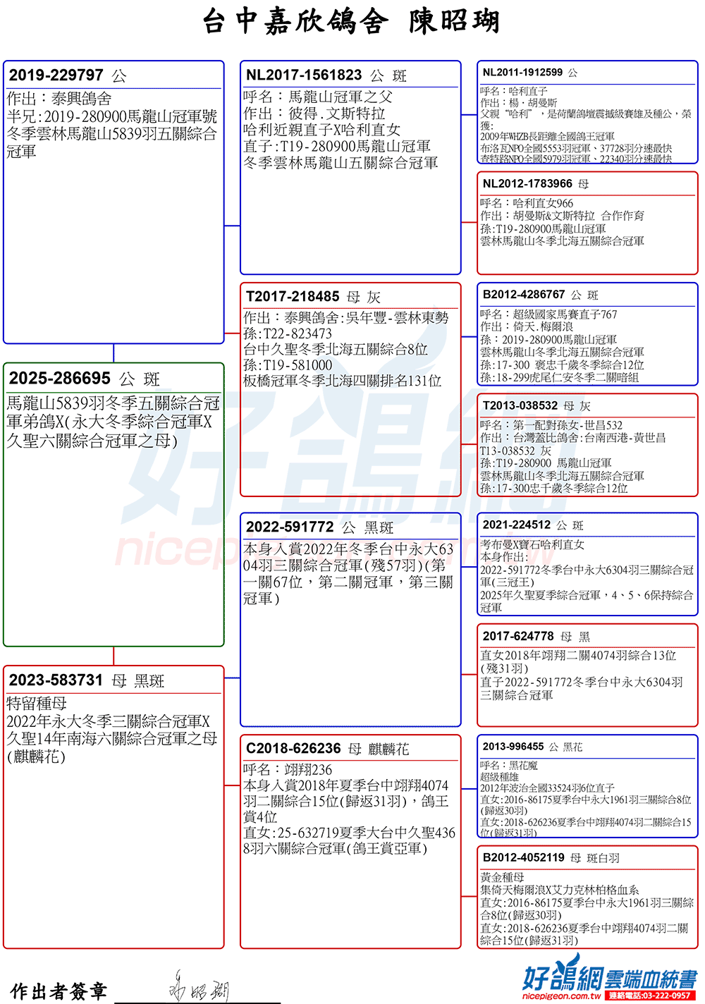 馬龍山5839羽冬季五關綜合冠軍弟鴿X(永大冬季綜合冠軍X久聖六關綜合冠軍之母)