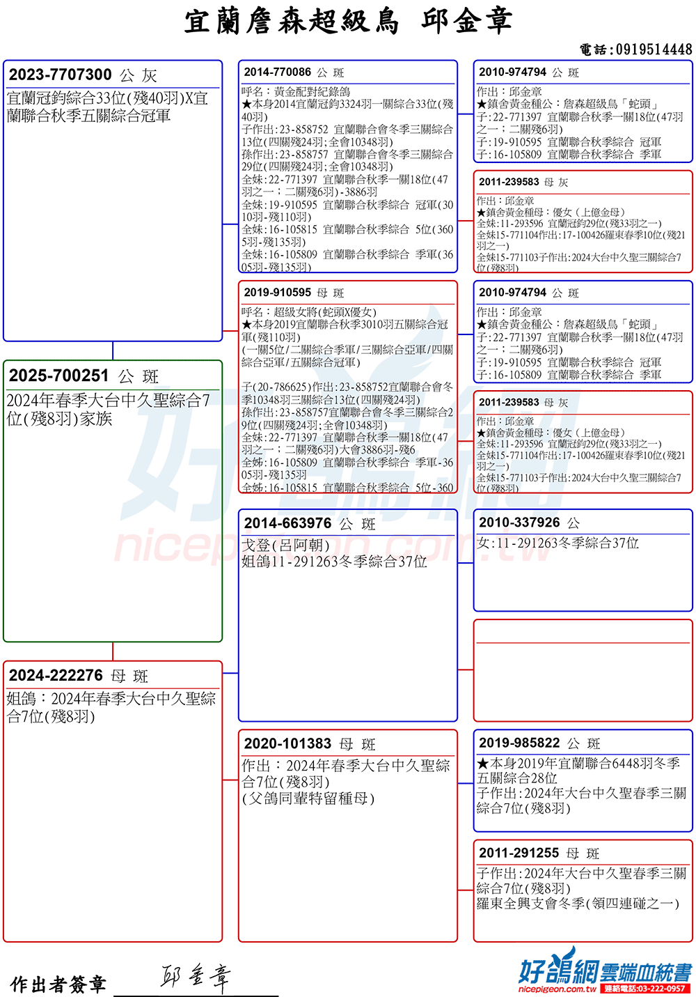 「超級鳥蛇頭」與「上億金母優女」這個黃金組合,為邱金章鴿舍打下穩固的基石,作出不計其數的入賞鴿,為邱金章的海翔成績取得巨大的成就。