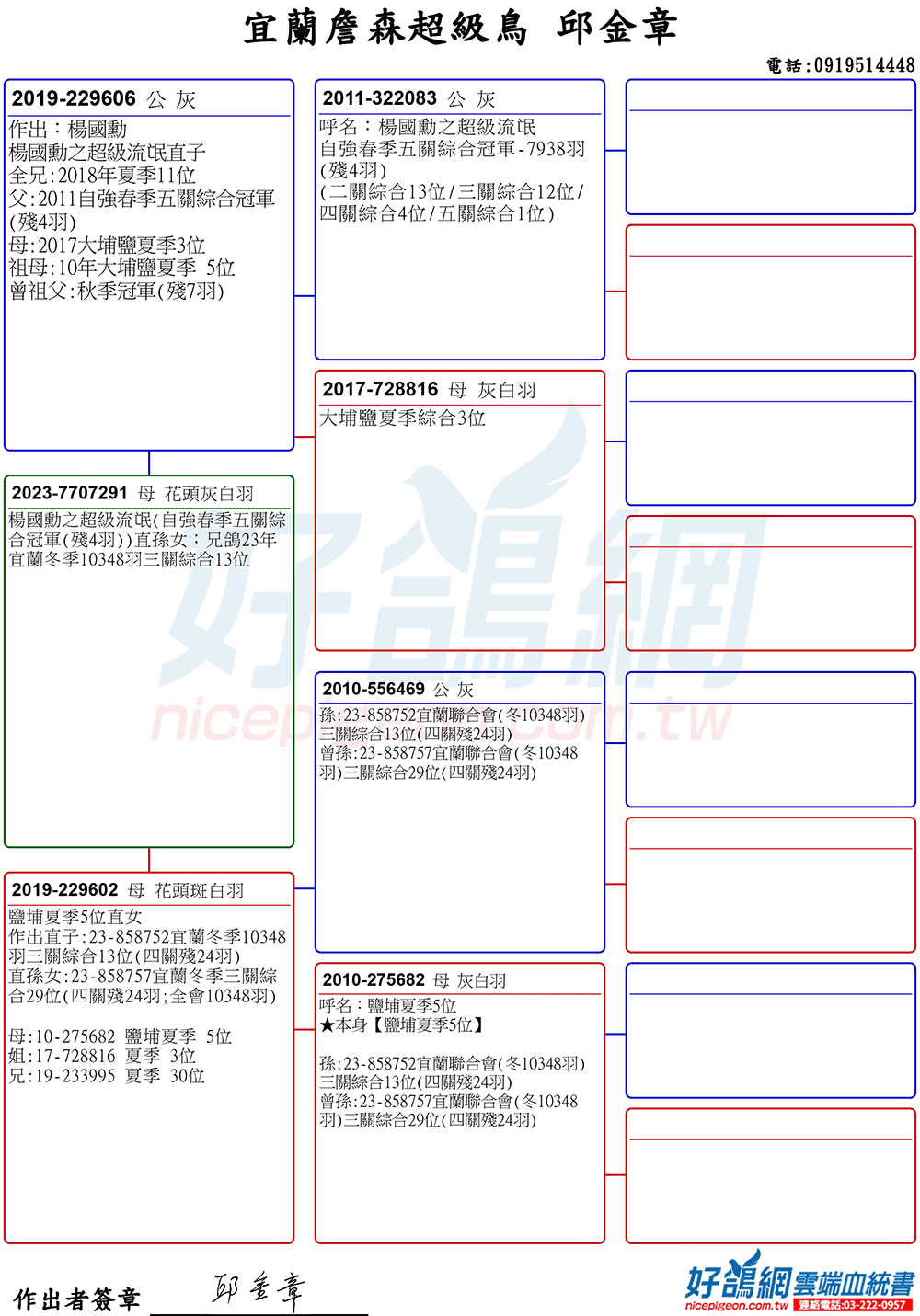 楊國勳之超級流氓(自強春季五關綜合冠軍(殘4羽))直孫女;兄鴿23年宜蘭冬季10348羽三關綜合13位