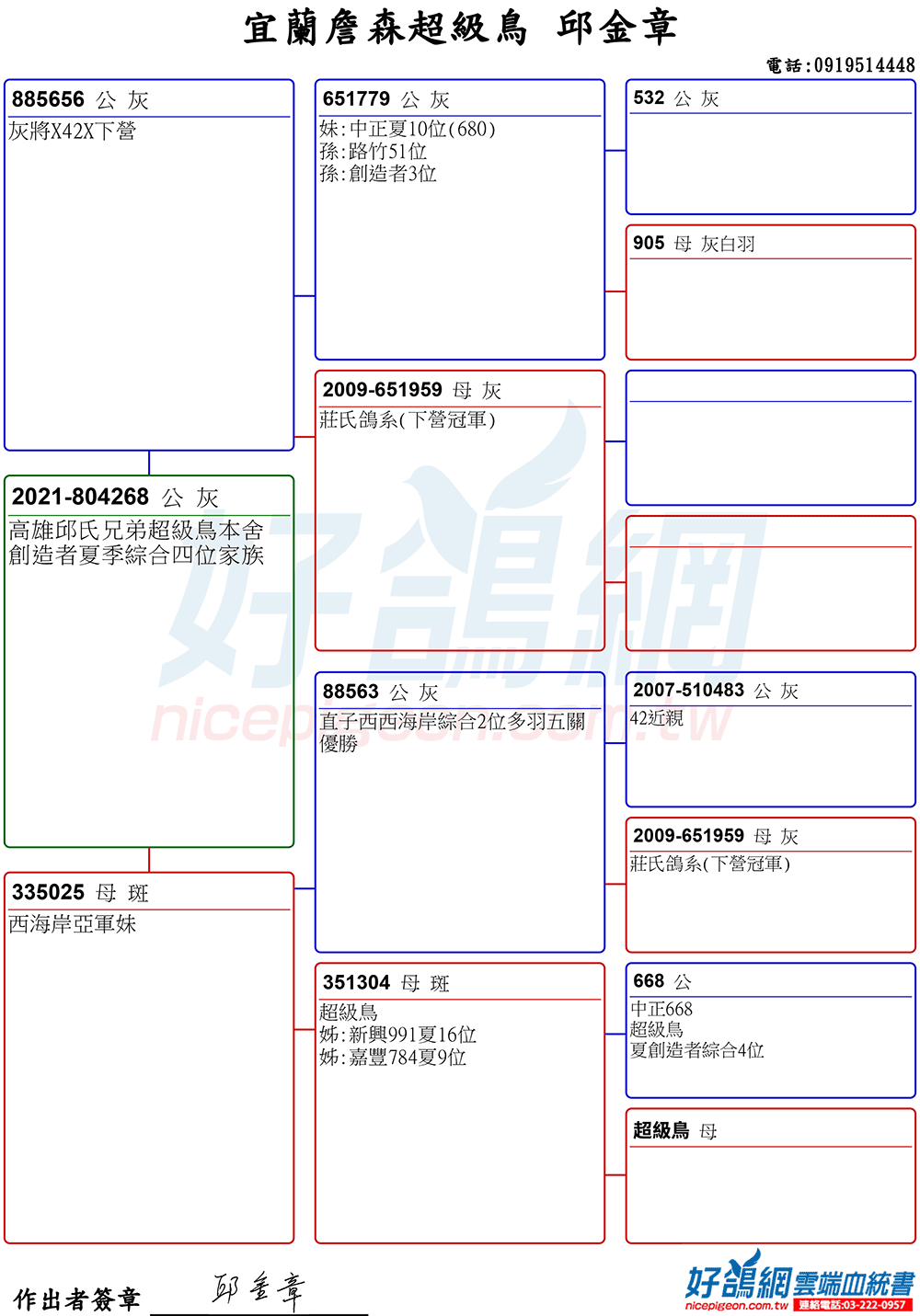 「超級鳥蛇頭」與「上億金母優女」這個黃金組合,為邱金章鴿舍打下穩固的基石,作出不計其數的入賞鴿,為邱金章的海翔成績取得巨大的成就。