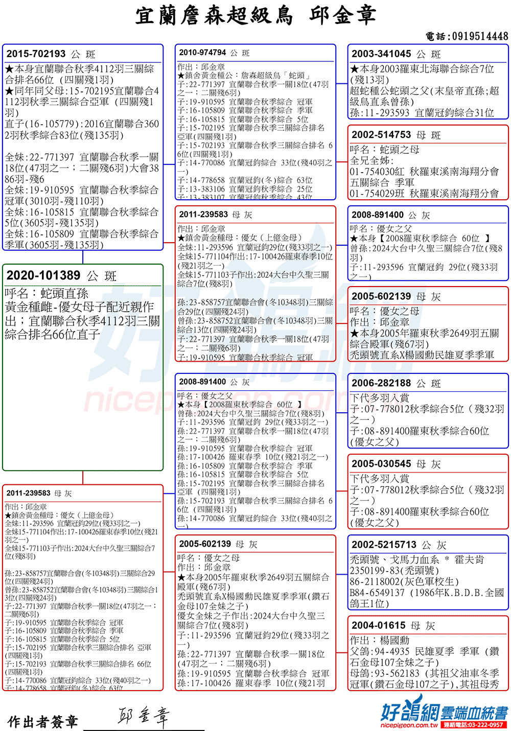 「超級鳥蛇頭」與「上億金母優女」這個黃金組合,為邱金章鴿舍打下穩固的基石,作出不計其數的入賞鴿,為邱金章的海翔成績取得巨大的成就。