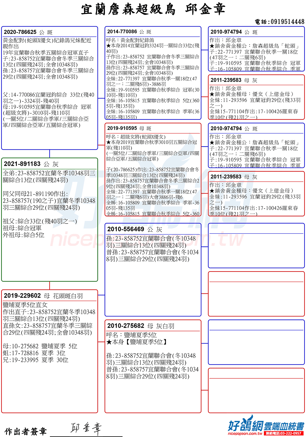 全弟23年宜蘭冬季10348羽三關綜合13位(四關殘24羽);同父母作出:23年宜蘭冬季三關綜合29位