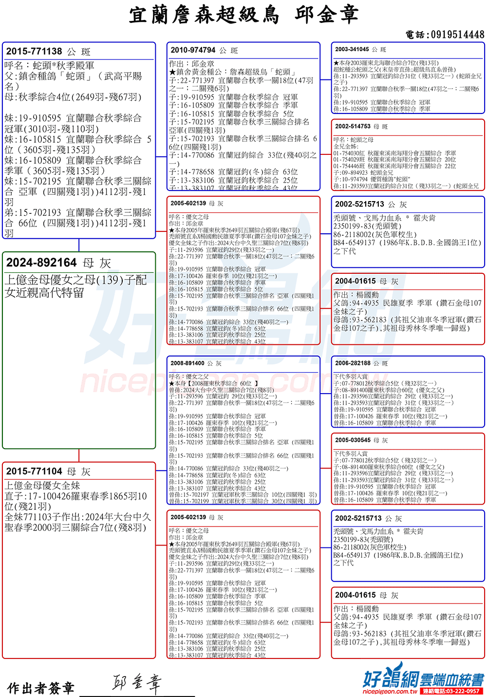 「超級鳥蛇頭」與「上億金母優女」這個黃金組合,為邱金章鴿舍打下穩固的基石,作出不計其數的入賞鴿,為邱金章的海翔成績取得巨大的成就。