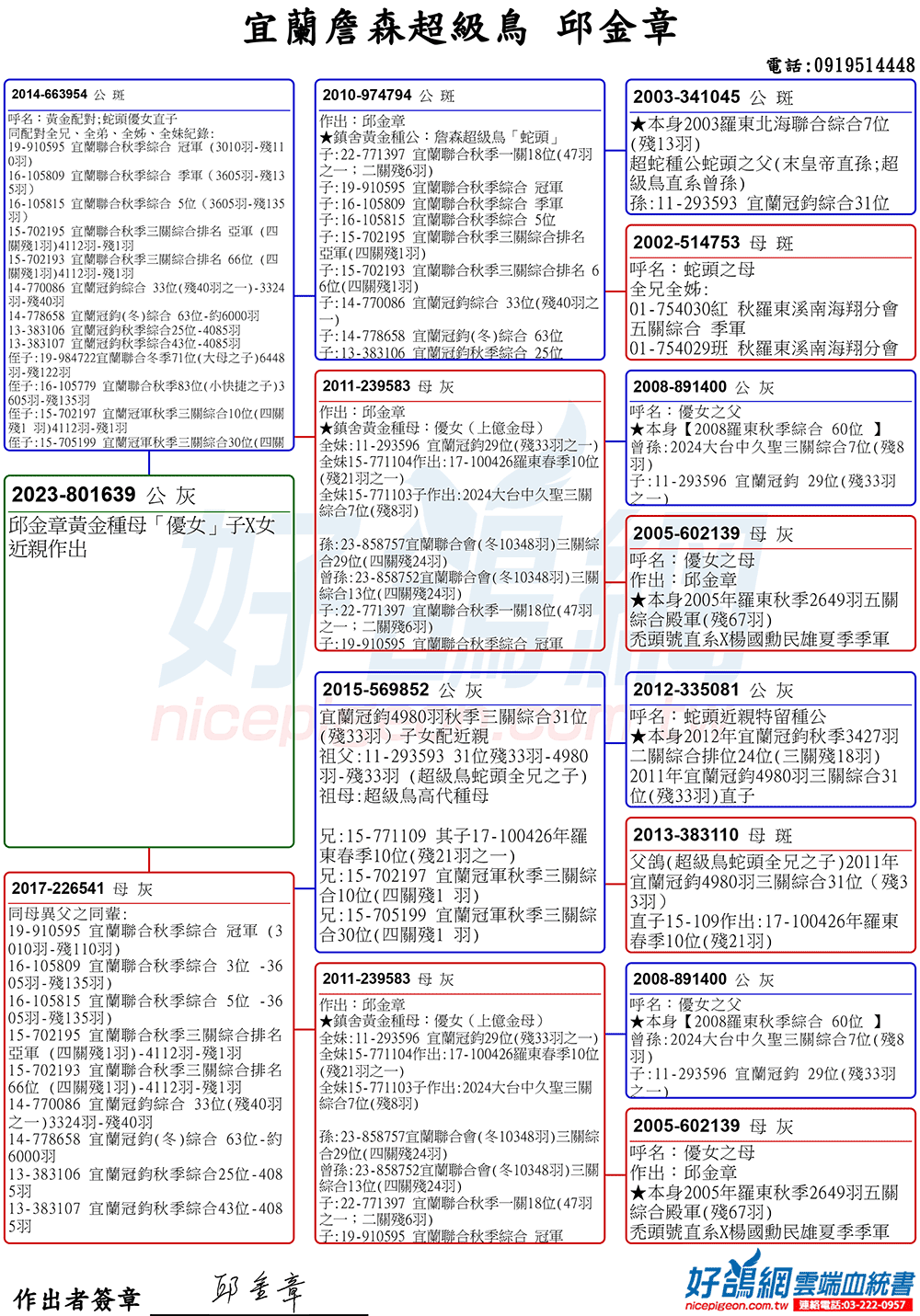 「超級鳥蛇頭」與「上億金母優女」這個黃金組合,為邱金章鴿舍打下穩固的基石,作出不計其數的入賞鴿,為邱金章的海翔成績取得巨大的成就。