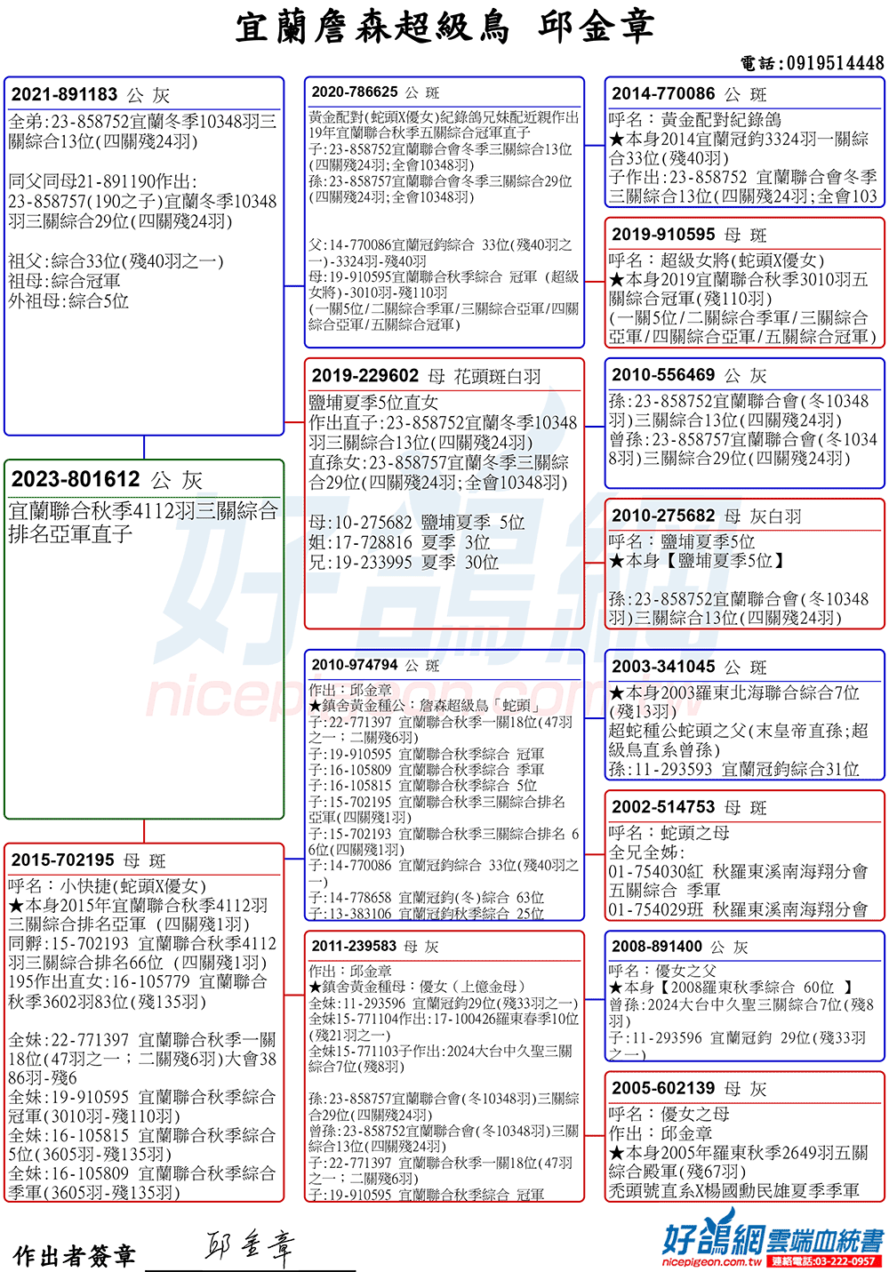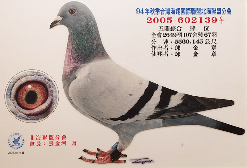 「超級鳥蛇頭」與「上億金母優女」這個黃金組合,為邱金章鴿舍打下穩固的基石,作出不計其數的入賞鴿,為邱金章的海翔成績取得巨大的成就。