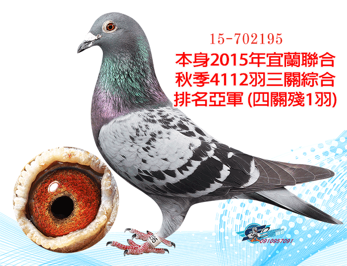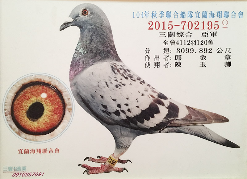 ▲母鴿:15-702195秋季宜蘭聯合三關綜合排名亞軍(四關殘1羽)(拍賣鴿NO116)