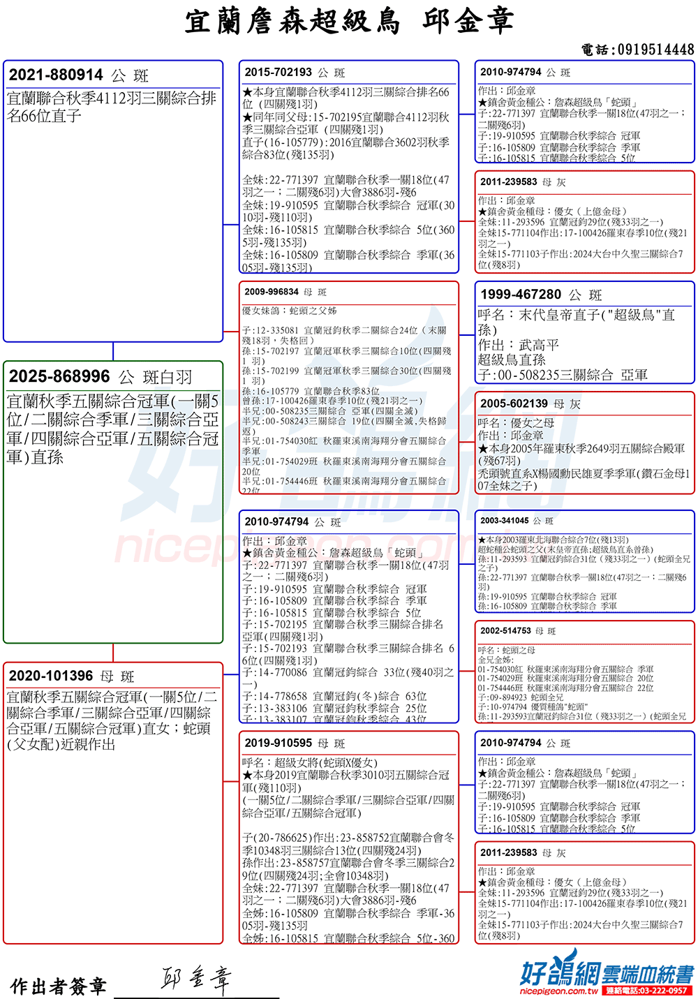 「超級鳥蛇頭」與「上億金母優女」這個黃金組合,為邱金章鴿舍打下穩固的基石,作出不計其數的入賞鴿,為邱金章的海翔成績取得巨大的成就。