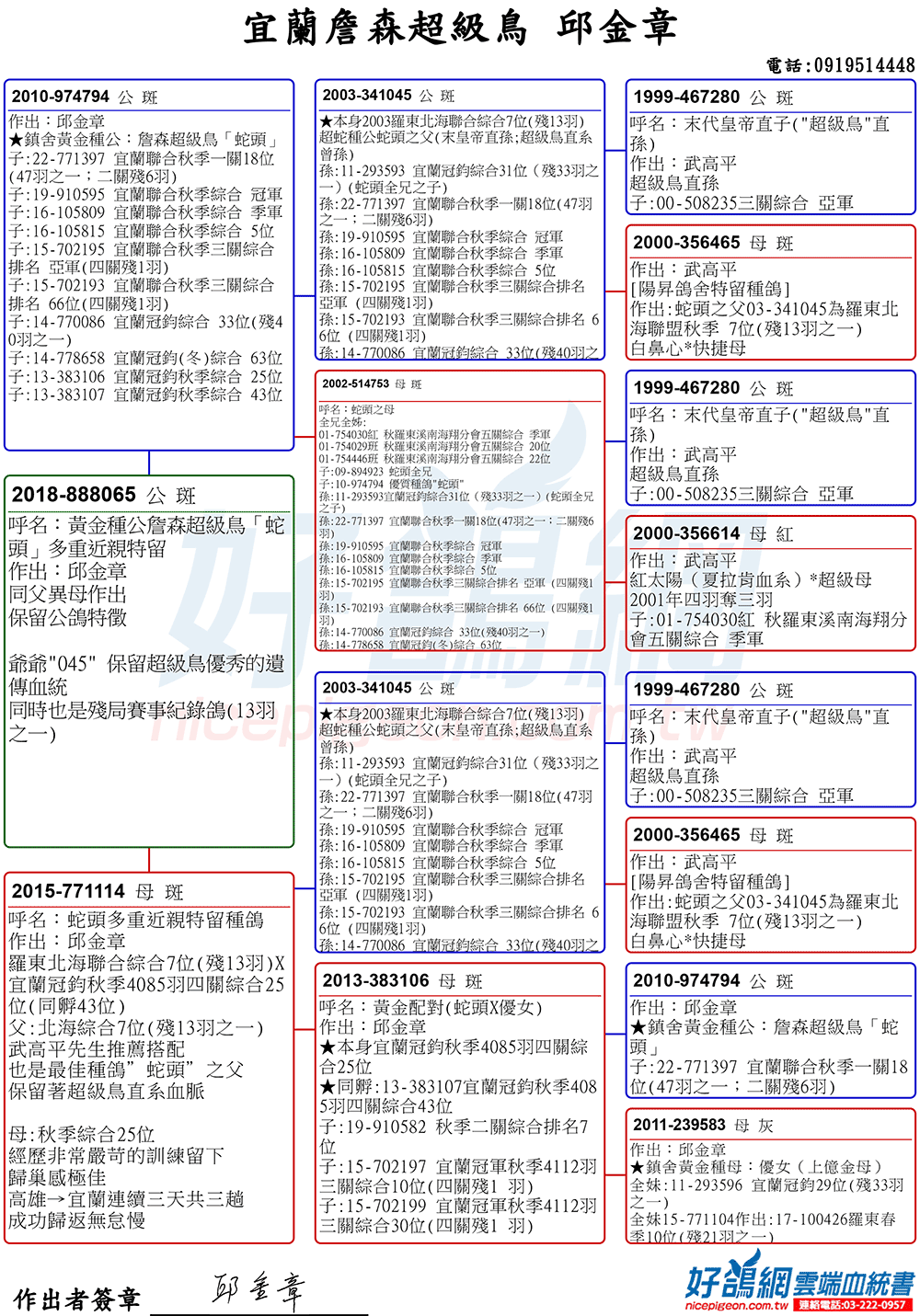 「超級鳥蛇頭」與「上億金母優女」這個黃金組合,為邱金章鴿舍打下穩固的基石,作出不計其數的入賞鴿,為邱金章的海翔成績取得巨大的成就。