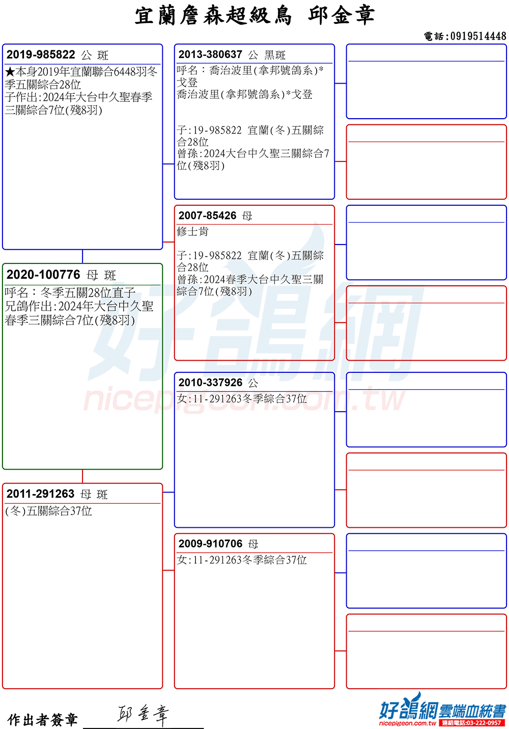 這組黃金配對,不只是宜蘭地區發揮,在2024年大台中久聖春季三關綜合7位(種鴿提供)的殘8羽賽事中也取得優異的成績。