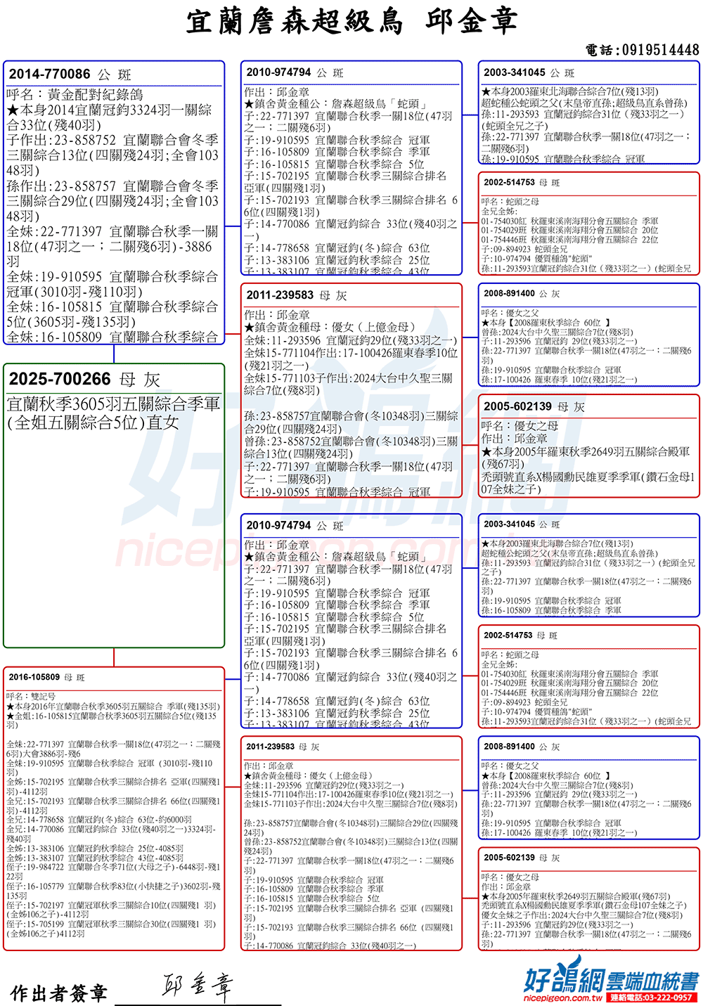 「超級鳥蛇頭」與「上億金母優女」這個黃金組合,為邱金章鴿舍打下穩固的基石,作出不計其數的入賞鴿,為邱金章的海翔成績取得巨大的成就。