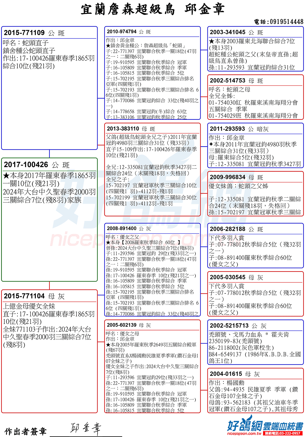 「超級鳥蛇頭」與「上億金母優女」這個黃金組合,為邱金章鴿舍打下穩固的基石,作出不計其數的入賞鴿,為邱金章的海翔成績取得巨大的成就。