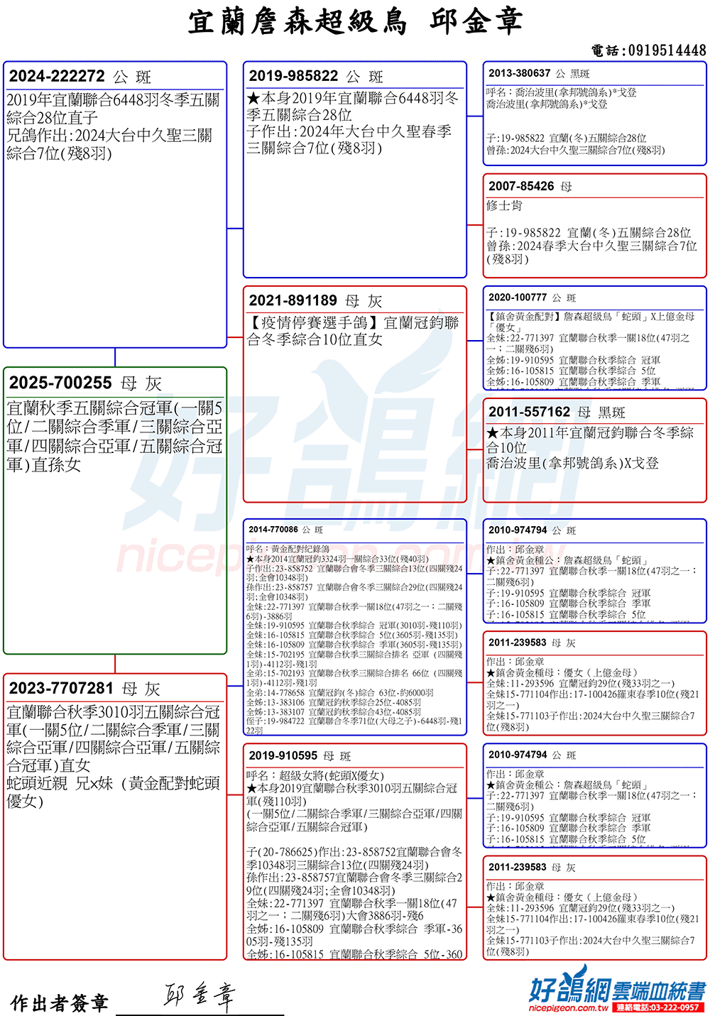 邱金章也導入高雄強豪邱氏兄弟的超級鳥家族,邱氏兄弟的超級鳥家族在南海賽事所向披靡。好的鴿種不分賽季與地區,邱金章引進之後也作出2025年宜蘭夏季2195羽一關綜合排名55位,足可顯示詹森超級鳥不凡的競賽能力。