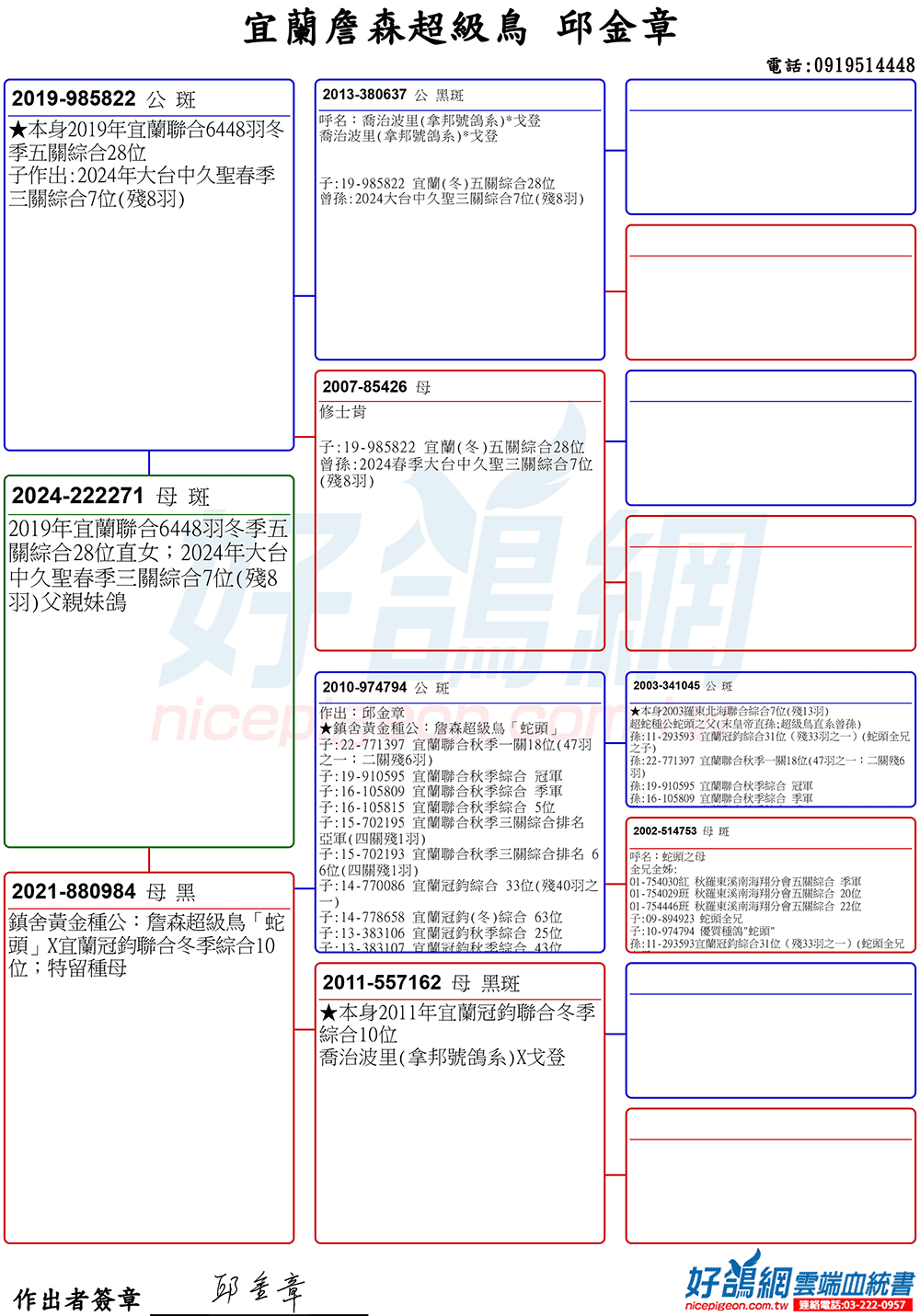 「超級鳥蛇頭」與「上億金母優女」這個黃金組合,為邱金章鴿舍打下穩固的基石,作出不計其數的入賞鴿,為邱金章的海翔成績取得巨大的成就。