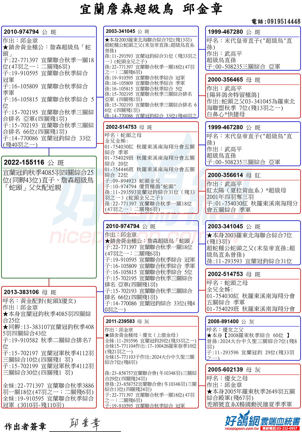 「超級鳥蛇頭」與「上億金母優女」這個黃金組合,為邱金章鴿舍打下穩固的基石,作出不計其數的入賞鴿,為邱金章的海翔成績取得巨大的成就。