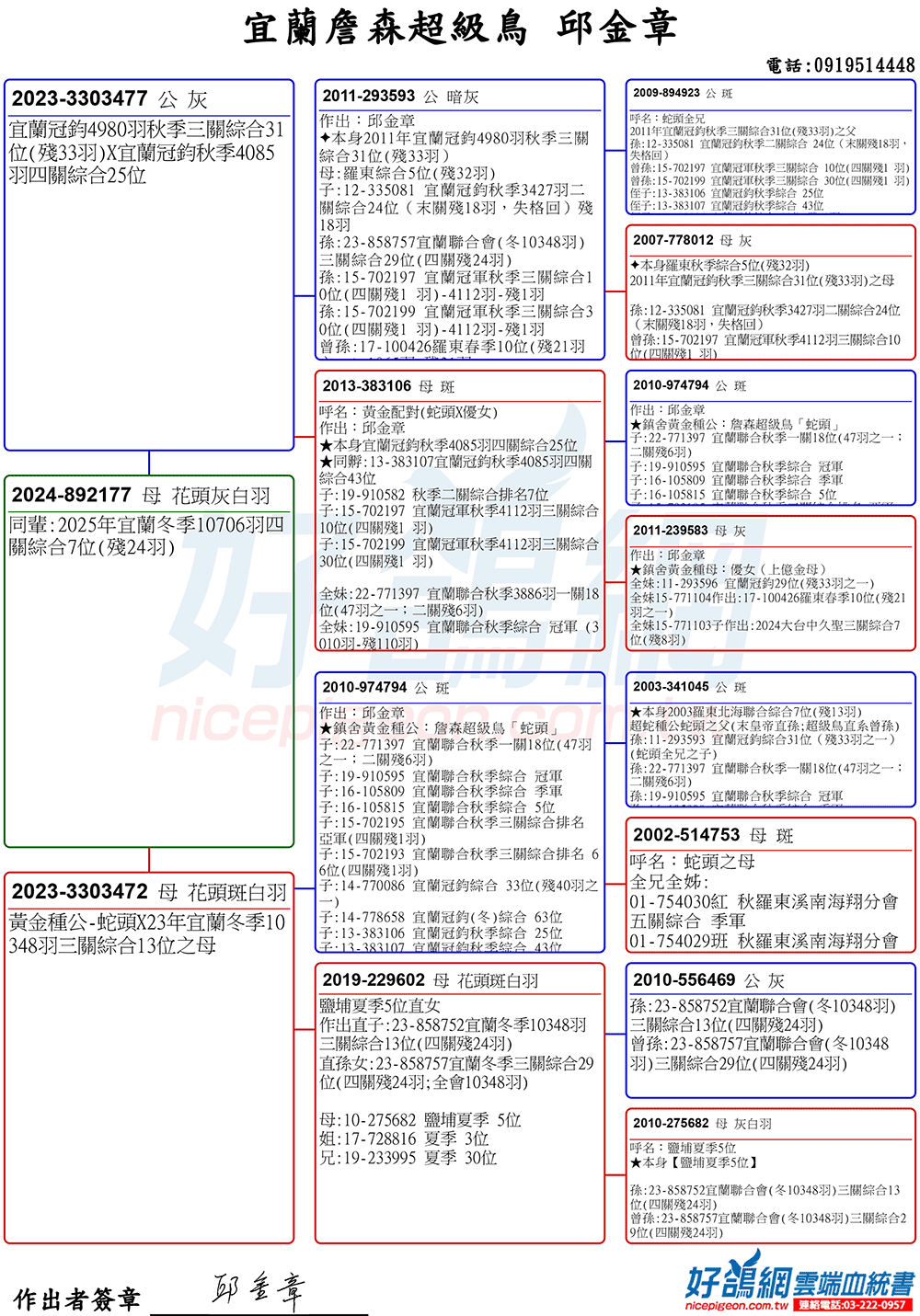 「超級鳥蛇頭」與「上億金母優女」這個黃金組合,為邱金章鴿舍打下穩固的基石,作出不計其數的入賞鴿,為邱金章的海翔成績取得巨大的成就。