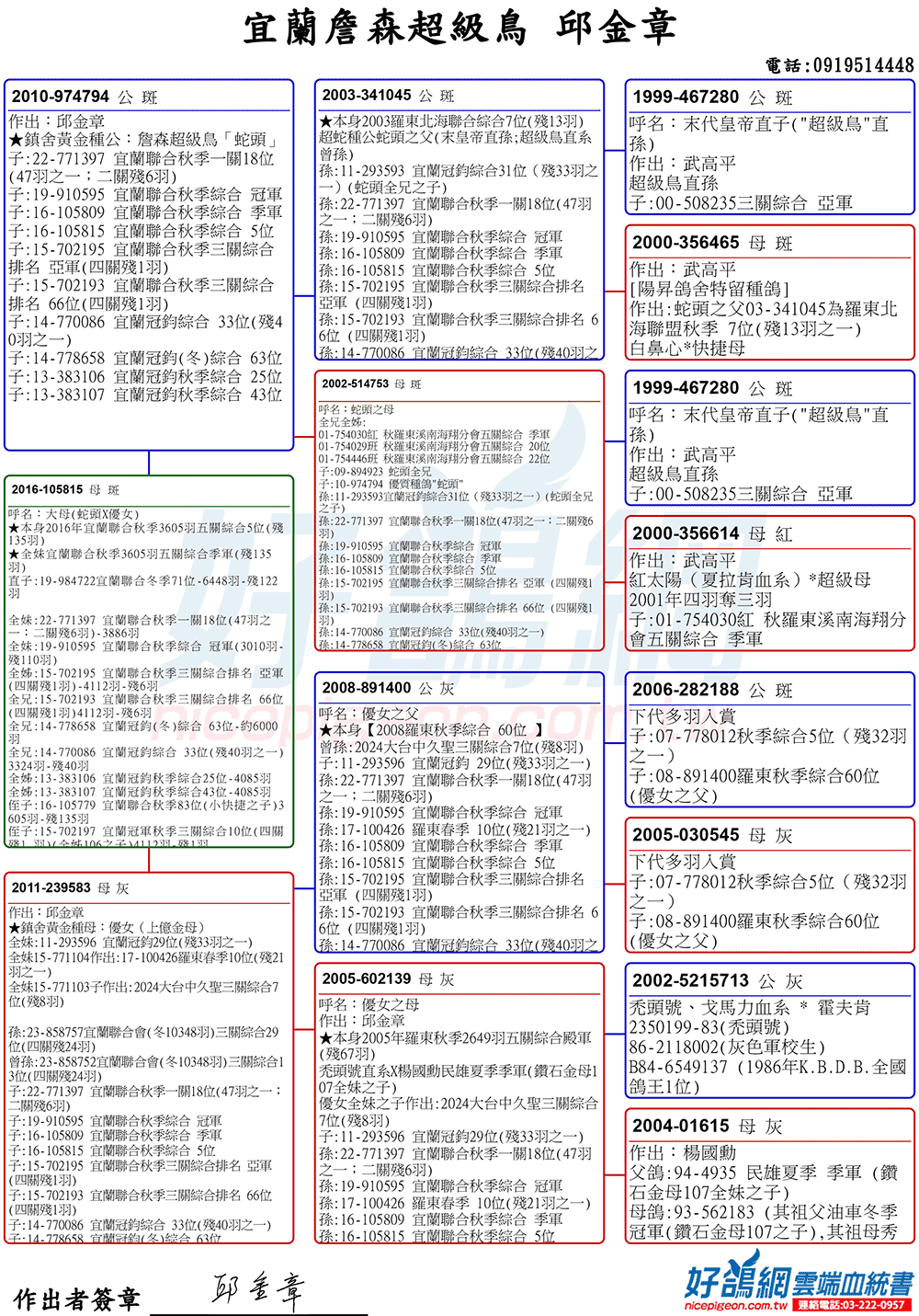 「超級鳥蛇頭」與「上億金母優女」這個黃金組合,為邱金章鴿舍打下穩固的基石,作出不計其數的入賞鴿,為邱金章的海翔成績取得巨大的成就。