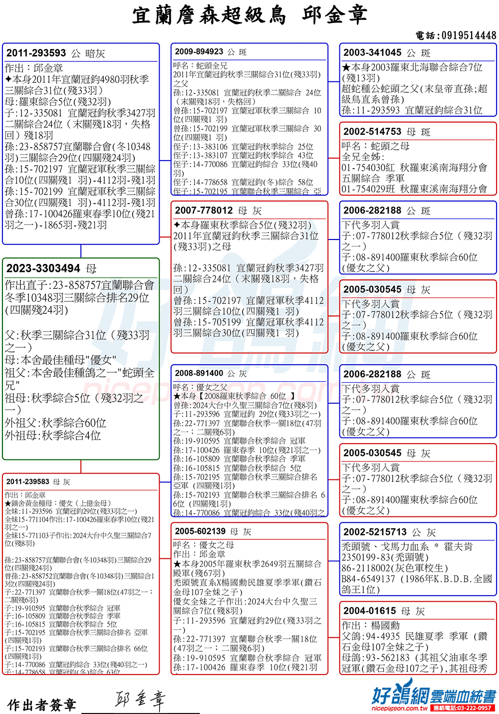 「超級鳥蛇頭」與「上億金母優女」這個黃金組合,為邱金章鴿舍打下穩固的基石,作出不計其數的入賞鴿,為邱金章的海翔成績取得巨大的成就。