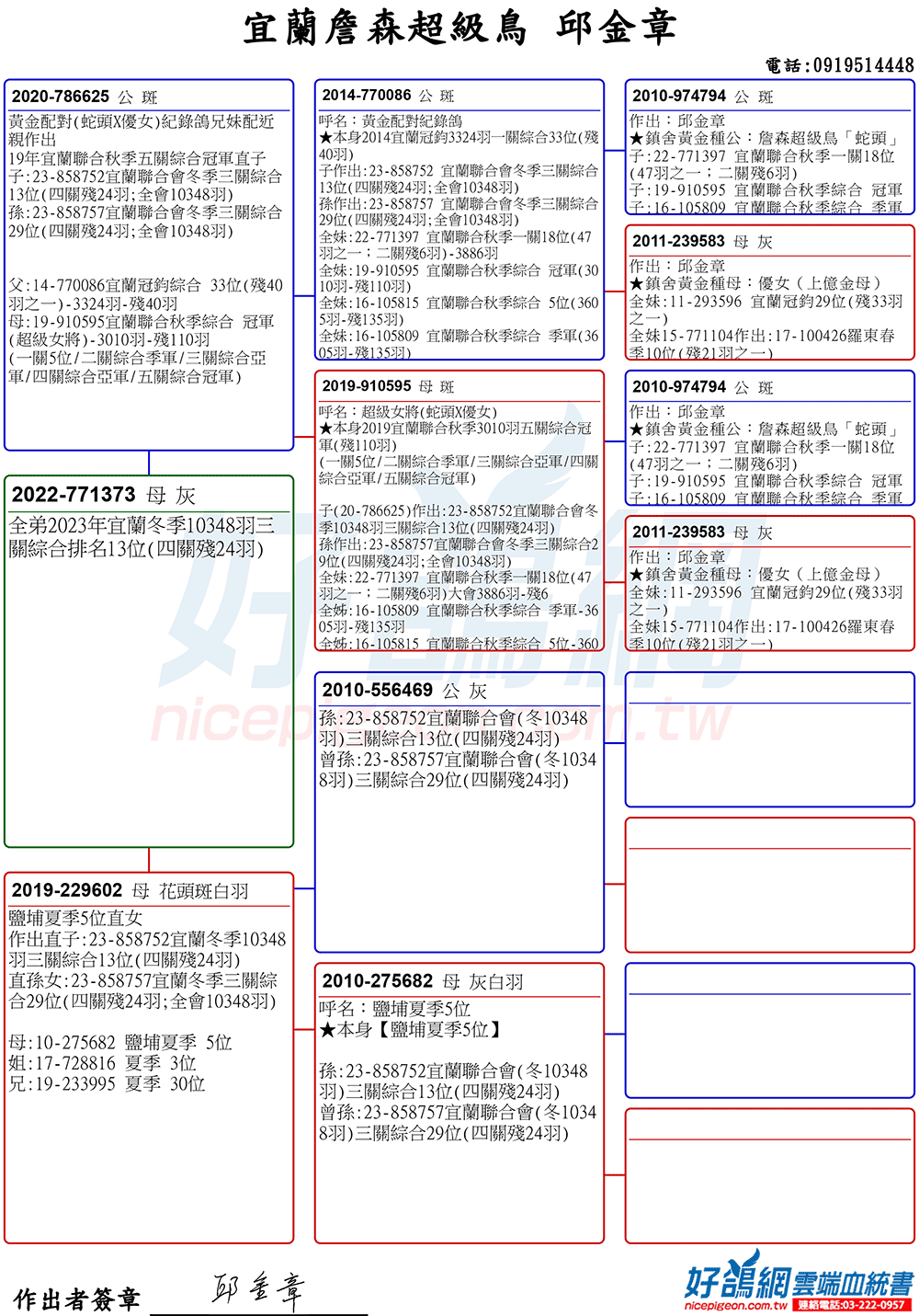 「超級鳥蛇頭」與「上億金母優女」這個黃金組合,為邱金章鴿舍打下穩固的基石,作出不計其數的入賞鴿,為邱金章的海翔成績取得巨大的成就。