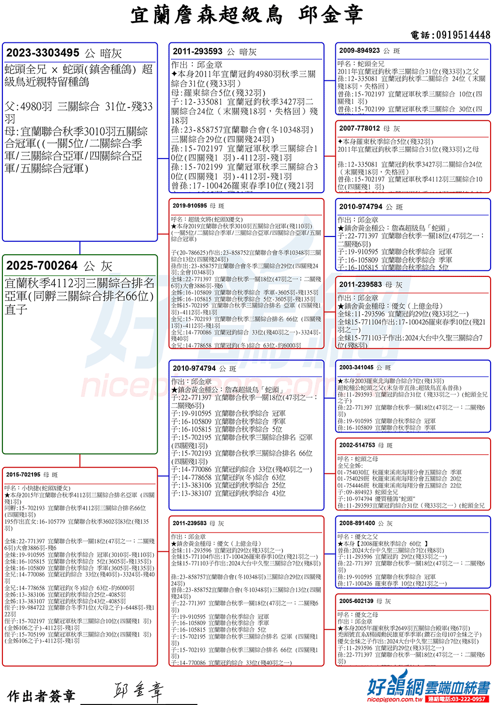 「超級鳥蛇頭」與「上億金母優女」這個黃金組合,為邱金章鴿舍打下穩固的基石,作出不計其數的入賞鴿,為邱金章的海翔成績取得巨大的成就。