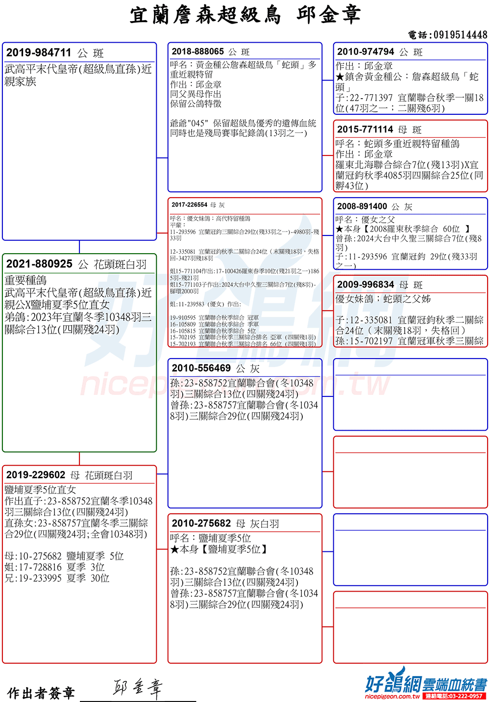 「超級鳥蛇頭」與「上億金母優女」這個黃金組合,為邱金章鴿舍打下穩固的基石,作出不計其數的入賞鴿,為邱金章的海翔成績取得巨大的成就。