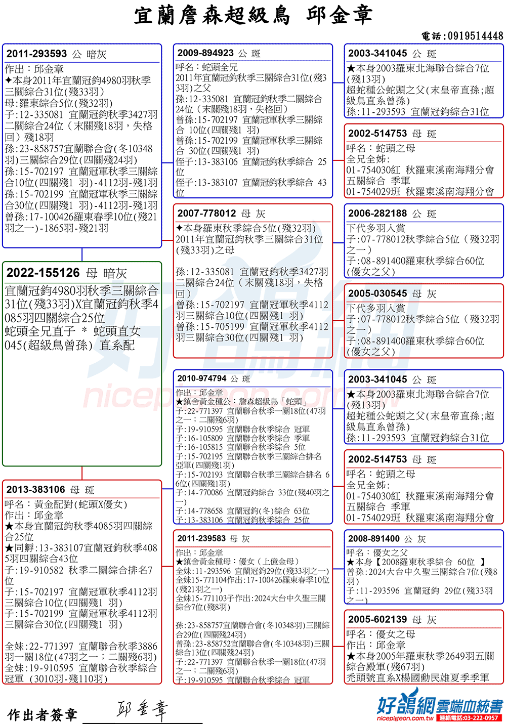 邱金章也導入高雄強豪邱氏兄弟的超級鳥家族,邱氏兄弟的超級鳥家族在南海賽事所向披靡。好的鴿種不分賽季與地區,邱金章引進之後也作出2025年宜蘭夏季2195羽一關綜合排名55位,足可顯示詹森超級鳥不凡的競賽能力。