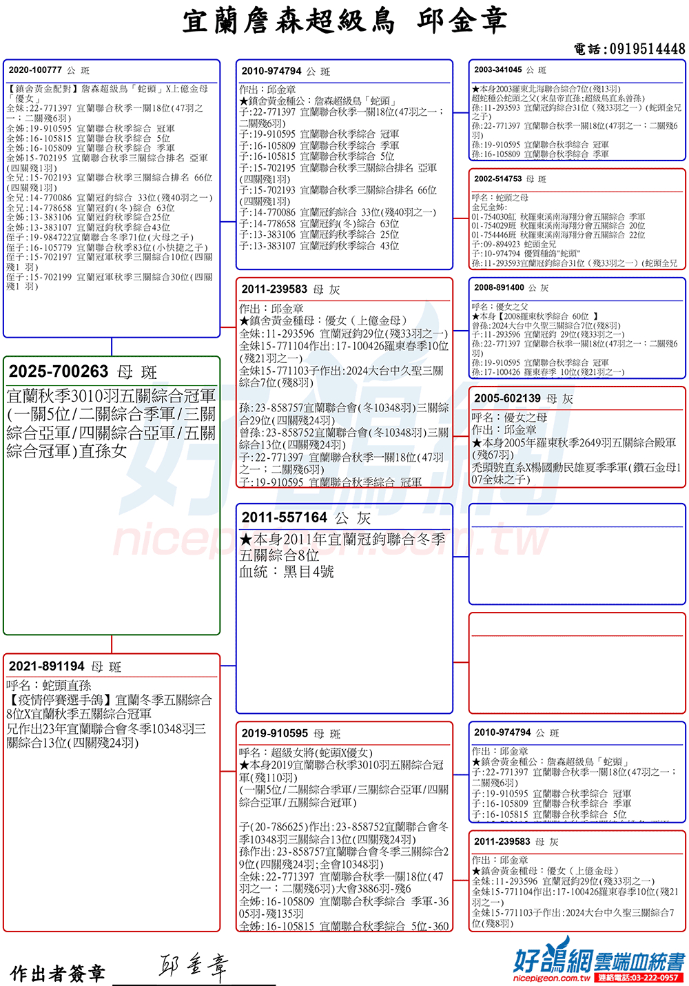 「超級鳥蛇頭」與「上億金母優女」這個黃金組合,為邱金章鴿舍打下穩固的基石,作出不計其數的入賞鴿,為邱金章的海翔成績取得巨大的成就。