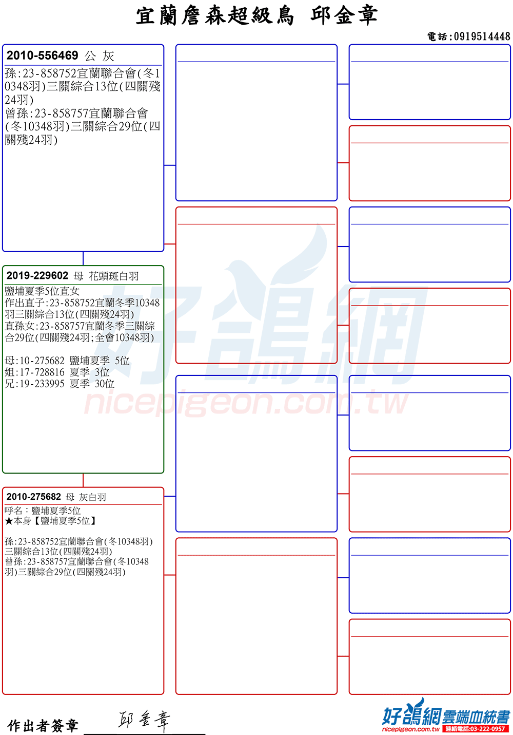 這組黃金配對,不只是宜蘭地區發揮,在2024年大台中久聖春季三關綜合7位(種鴿提供)的殘8羽賽事中也取得優異的成績。
