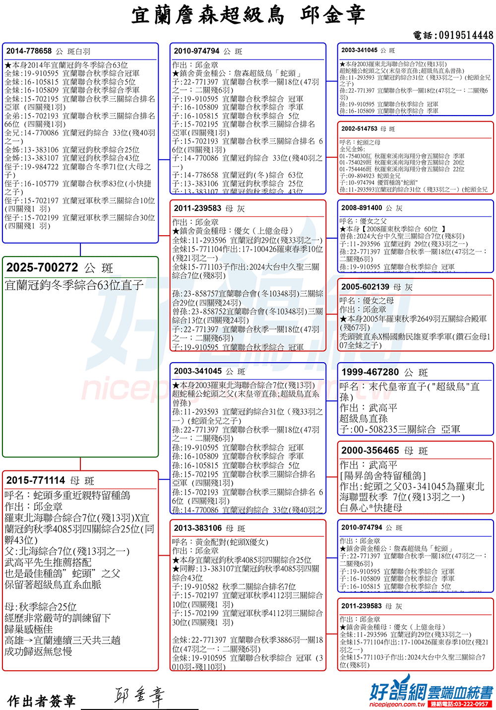 「超級鳥蛇頭」與「上億金母優女」這個黃金組合,為邱金章鴿舍打下穩固的基石,作出不計其數的入賞鴿,為邱金章的海翔成績取得巨大的成就。