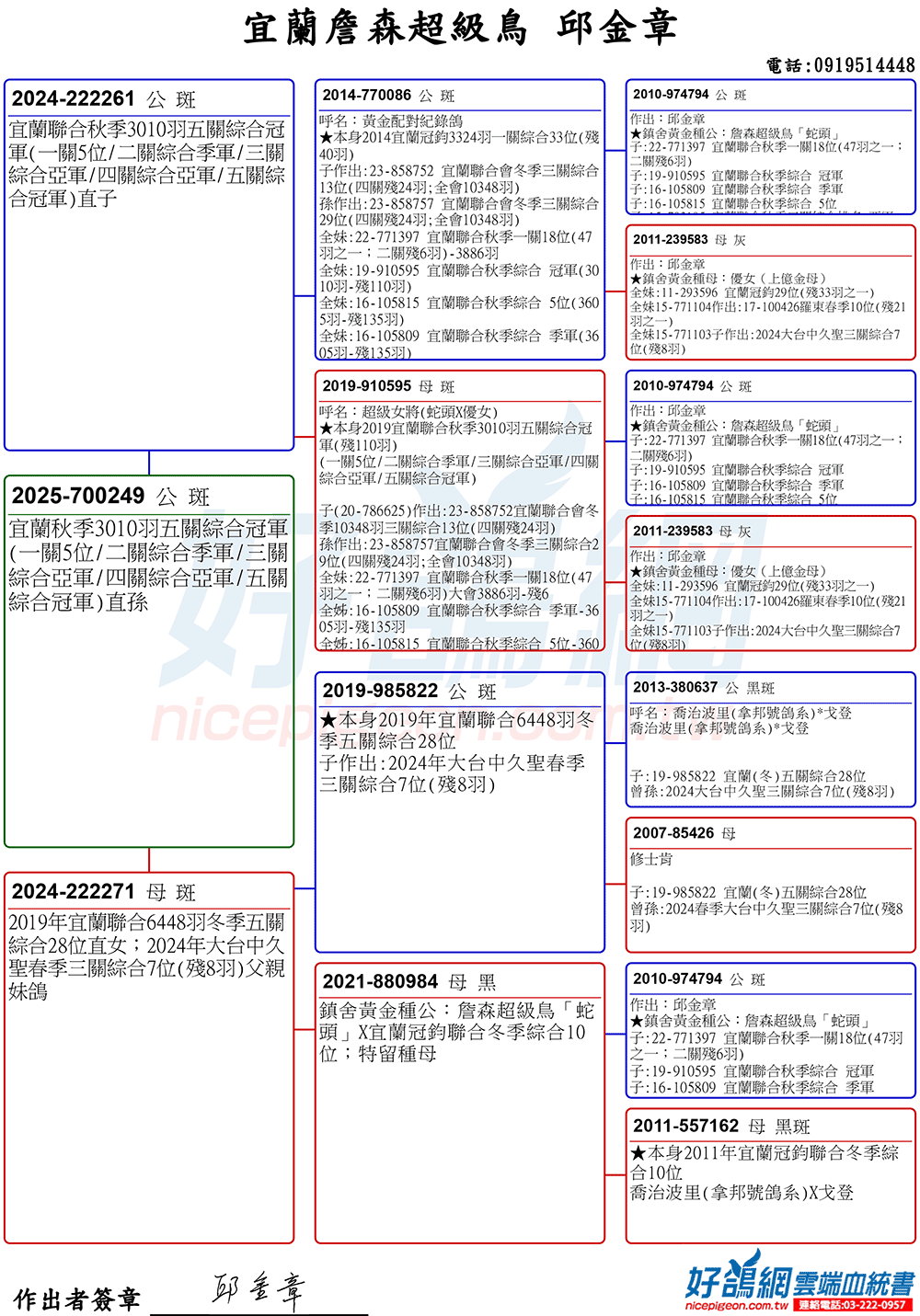 「超級鳥蛇頭」與「上億金母優女」這個黃金組合,為邱金章鴿舍打下穩固的基石,作出不計其數的入賞鴿,為邱金章的海翔成績取得巨大的成就。