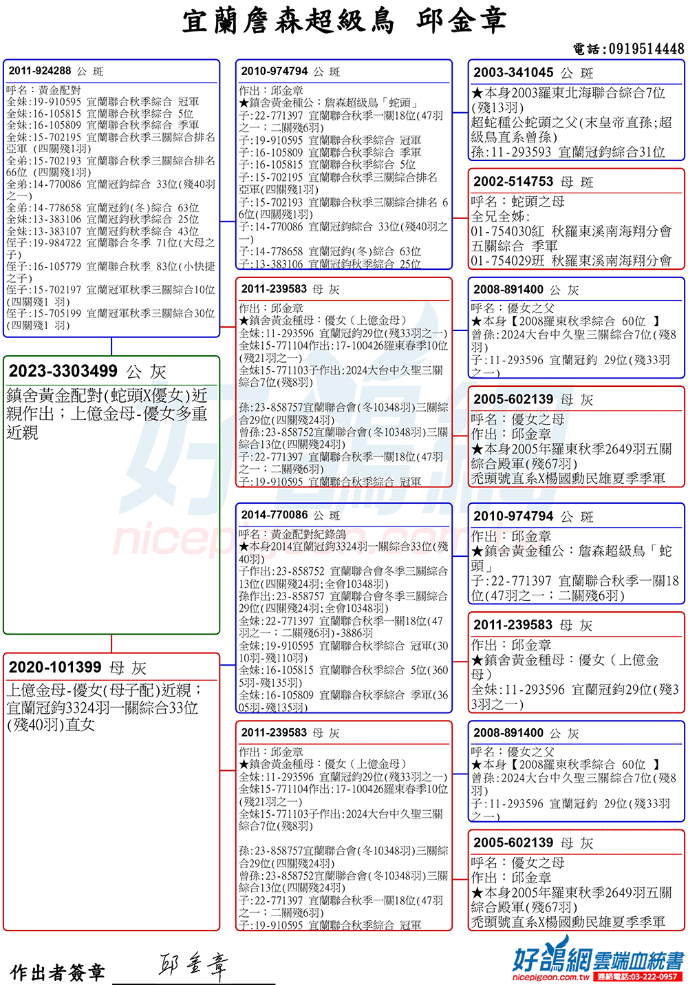 「超級鳥蛇頭」與「上億金母優女」這個黃金組合,為邱金章鴿舍打下穩固的基石,作出不計其數的入賞鴿,為邱金章的海翔成績取得巨大的成就。
