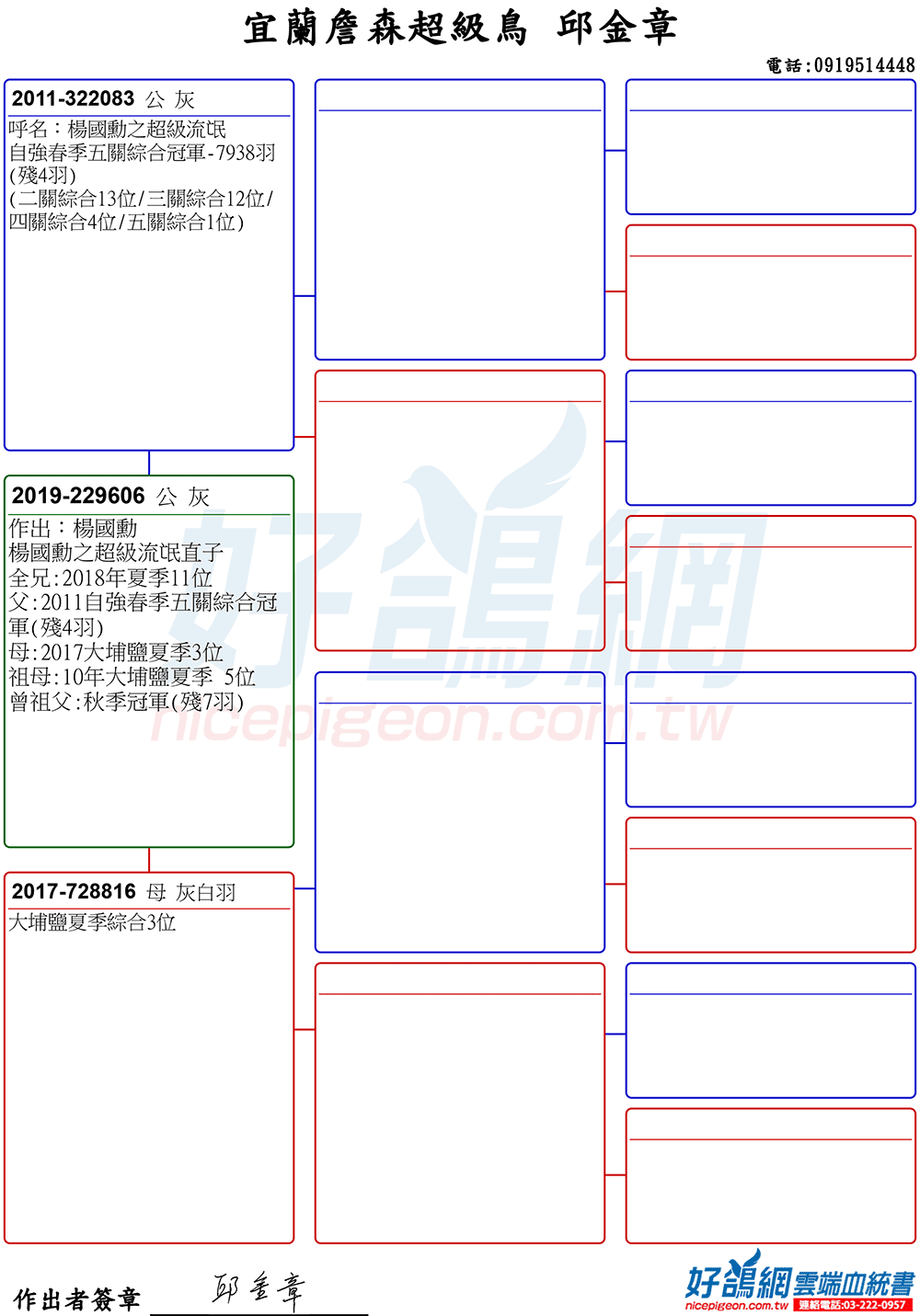 「超級鳥蛇頭」與「上億金母優女」這個黃金組合,為邱金章鴿舍打下穩固的基石,作出不計其數的入賞鴿,為邱金章的海翔成績取得巨大的成就。