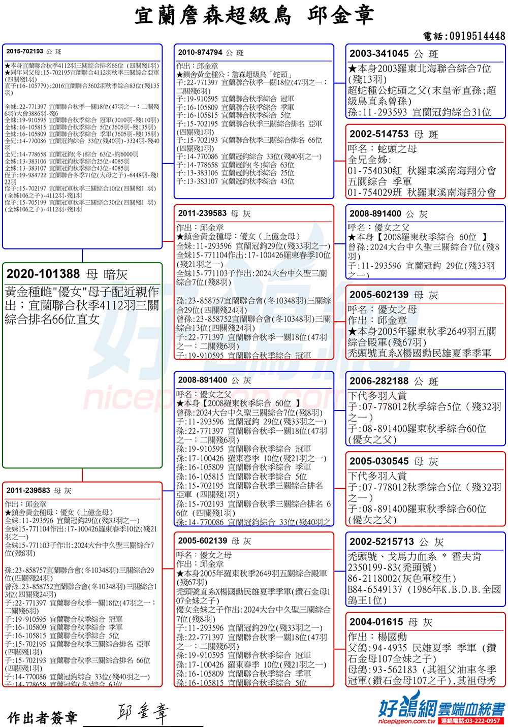 「超級鳥蛇頭」與「上億金母優女」這個黃金組合,為邱金章鴿舍打下穩固的基石,作出不計其數的入賞鴿,為邱金章的海翔成績取得巨大的成就。