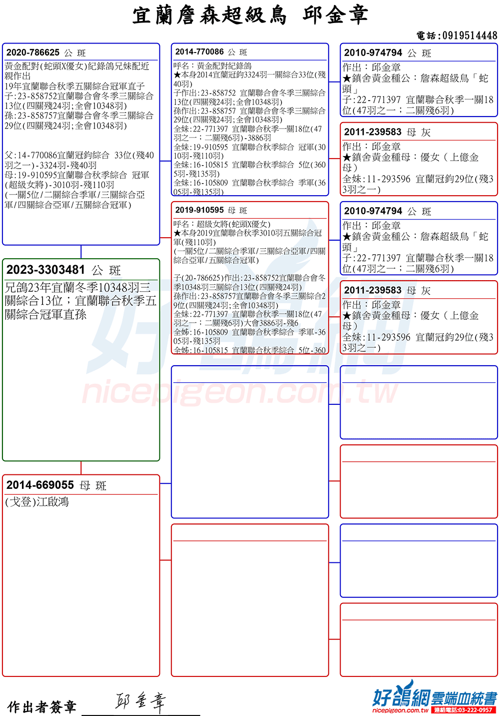 「超級鳥蛇頭」與「上億金母優女」這個黃金組合,為邱金章鴿舍打下穩固的基石,作出不計其數的入賞鴿,為邱金章的海翔成績取得巨大的成就。