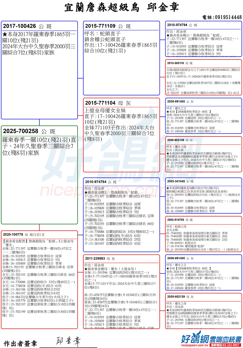 「超級鳥蛇頭」與「上億金母優女」這個黃金組合,為邱金章鴿舍打下穩固的基石,作出不計其數的入賞鴿,為邱金章的海翔成績取得巨大的成就。