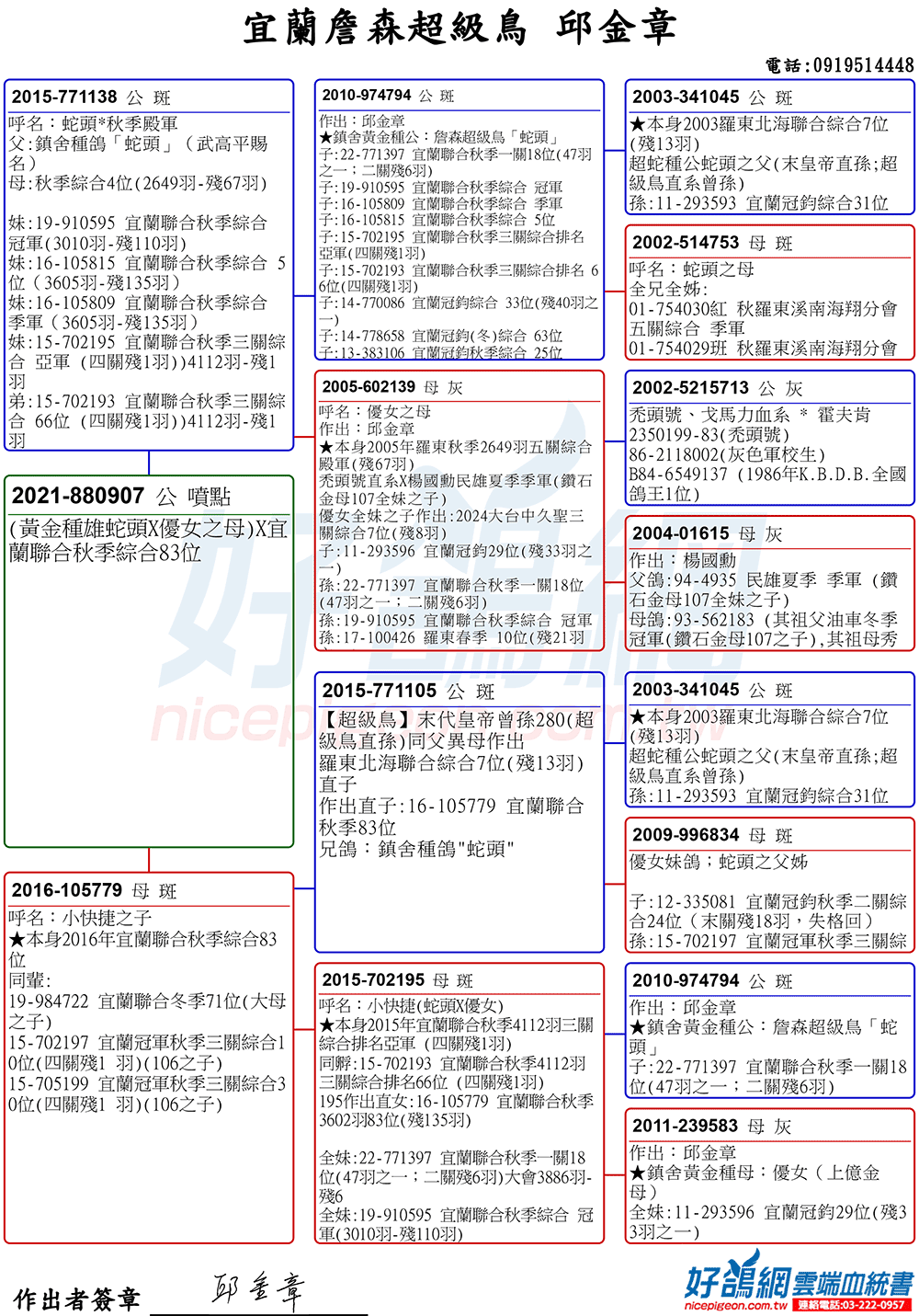「超級鳥蛇頭」與「上億金母優女」這個黃金組合,為邱金章鴿舍打下穩固的基石,作出不計其數的入賞鴿,為邱金章的海翔成績取得巨大的成就。