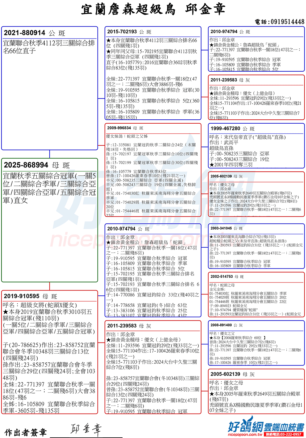 「超級鳥蛇頭」與「上億金母優女」這個黃金組合,為邱金章鴿舍打下穩固的基石,作出不計其數的入賞鴿,為邱金章的海翔成績取得巨大的成就。