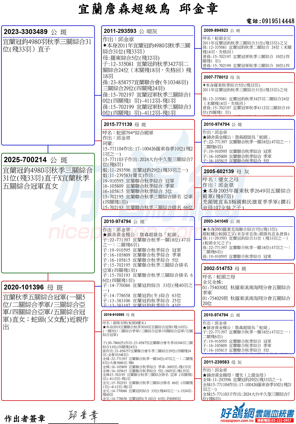 「超級鳥蛇頭」與「上億金母優女」這個黃金組合,為邱金章鴿舍打下穩固的基石,作出不計其數的入賞鴿,為邱金章的海翔成績取得巨大的成就。