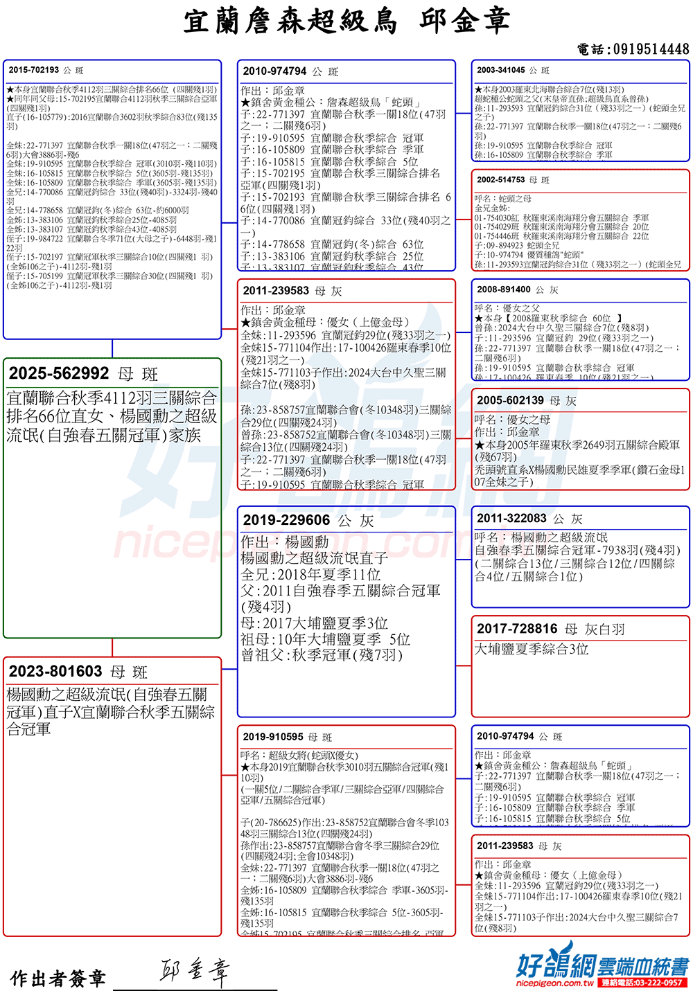 邱金章也導入高雄強豪邱氏兄弟的超級鳥家族,邱氏兄弟的超級鳥家族在南海賽事所向披靡。好的鴿種不分賽季與地區,邱金章引進之後也作出2025年宜蘭夏季2195羽一關綜合排名55位,足可顯示詹森超級鳥不凡的競賽能力。