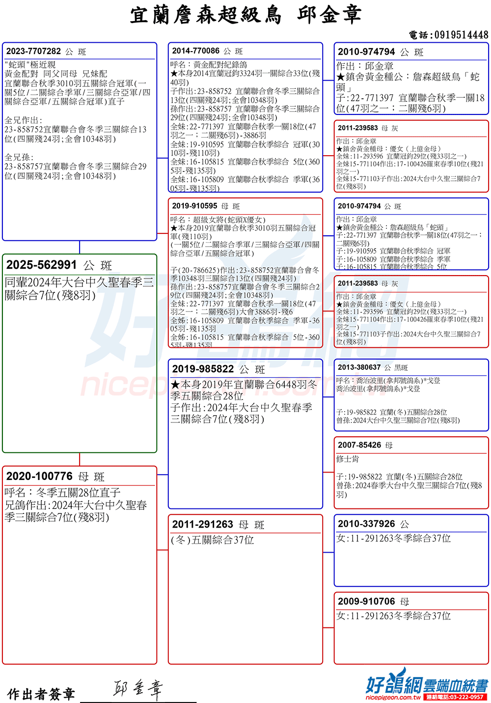 邱金章也導入高雄強豪邱氏兄弟的超級鳥家族,邱氏兄弟的超級鳥家族在南海賽事所向披靡。好的鴿種不分賽季與地區,邱金章引進之後也作出2025年宜蘭夏季2195羽一關綜合排名55位,足可顯示詹森超級鳥不凡的競賽能力。
