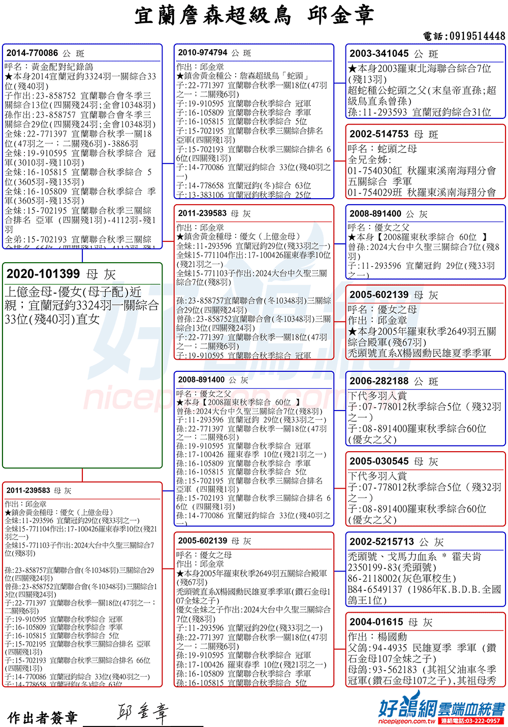 「超級鳥蛇頭」與「上億金母優女」這個黃金組合,為邱金章鴿舍打下穩固的基石,作出不計其數的入賞鴿,為邱金章的海翔成績取得巨大的成就。