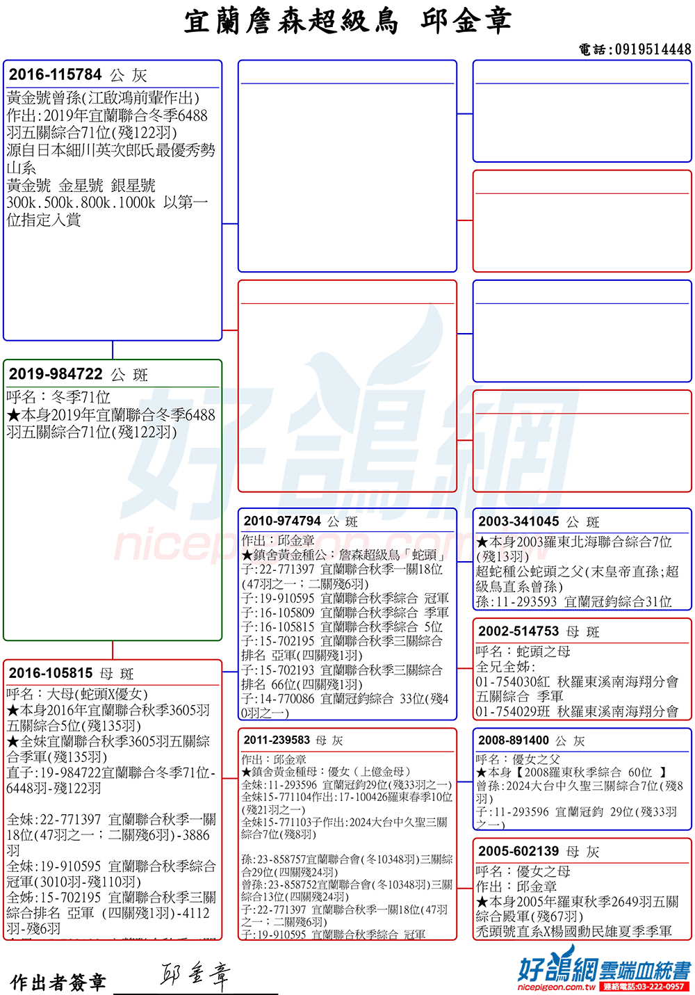 「超級鳥蛇頭」與「上億金母優女」這個黃金組合,為邱金章鴿舍打下穩固的基石,作出不計其數的入賞鴿,為邱金章的海翔成績取得巨大的成就。