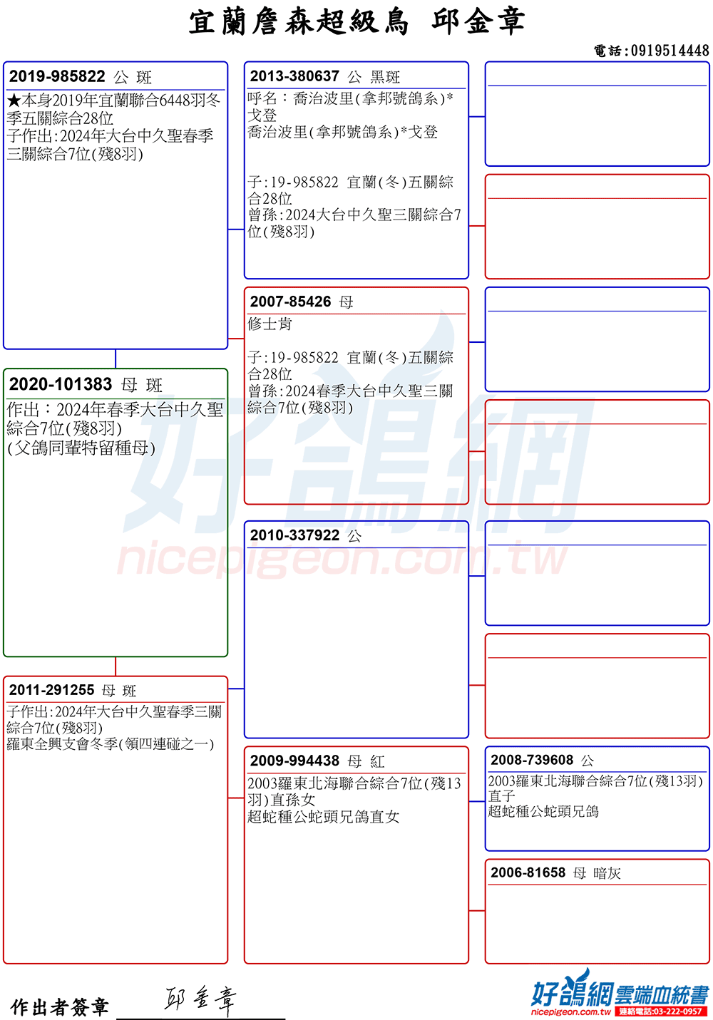 這組黃金配對,不只是宜蘭地區發揮,在2024年大台中久聖春季三關綜合7位(種鴿提供)的殘8羽賽事中也取得優異的成績。
