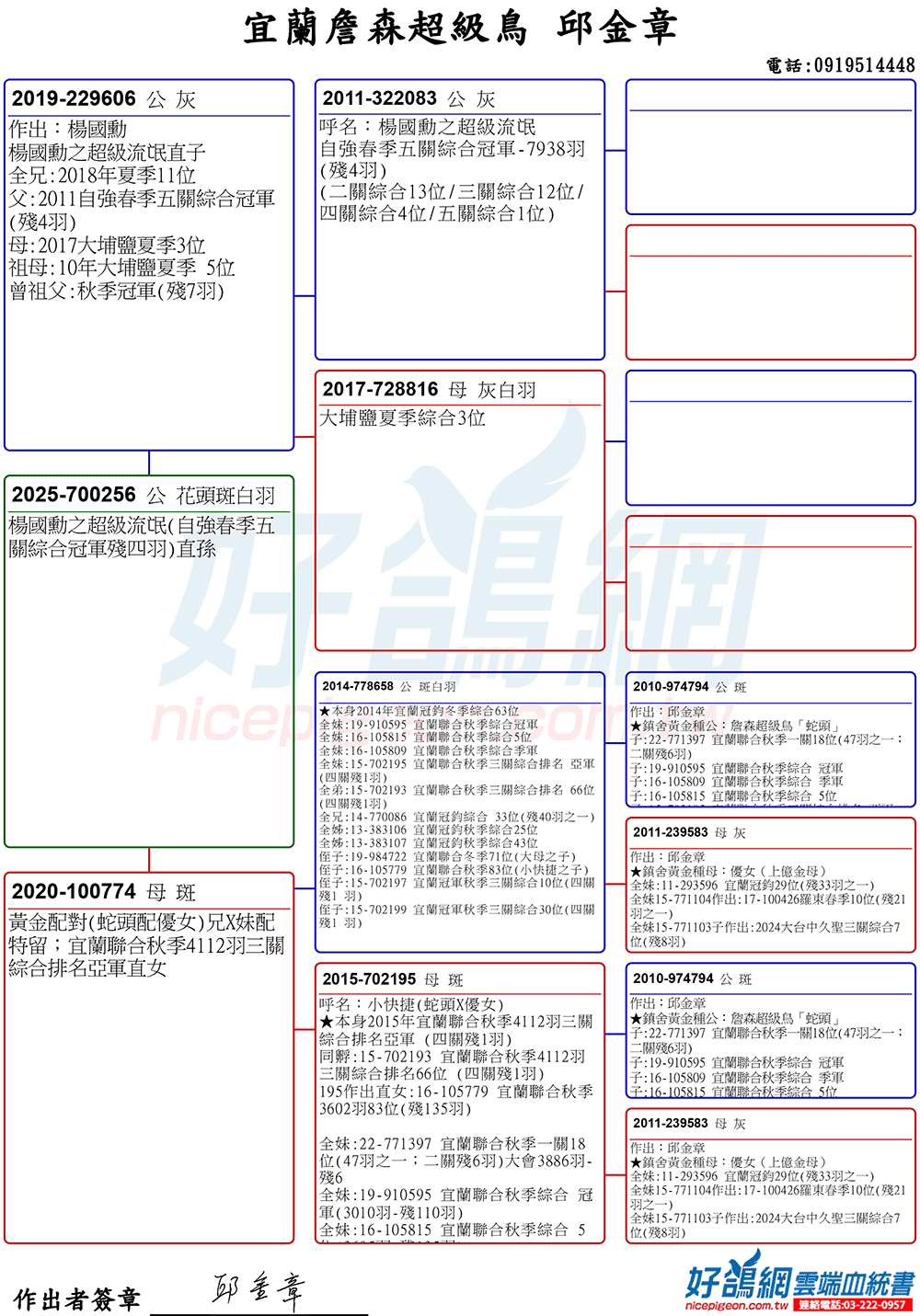 邱金章也導入高雄強豪邱氏兄弟的超級鳥家族,邱氏兄弟的超級鳥家族在南海賽事所向披靡。好的鴿種不分賽季與地區,邱金章引進之後也作出2025年宜蘭夏季2195羽一關綜合排名55位,足可顯示詹森超級鳥不凡的競賽能力。