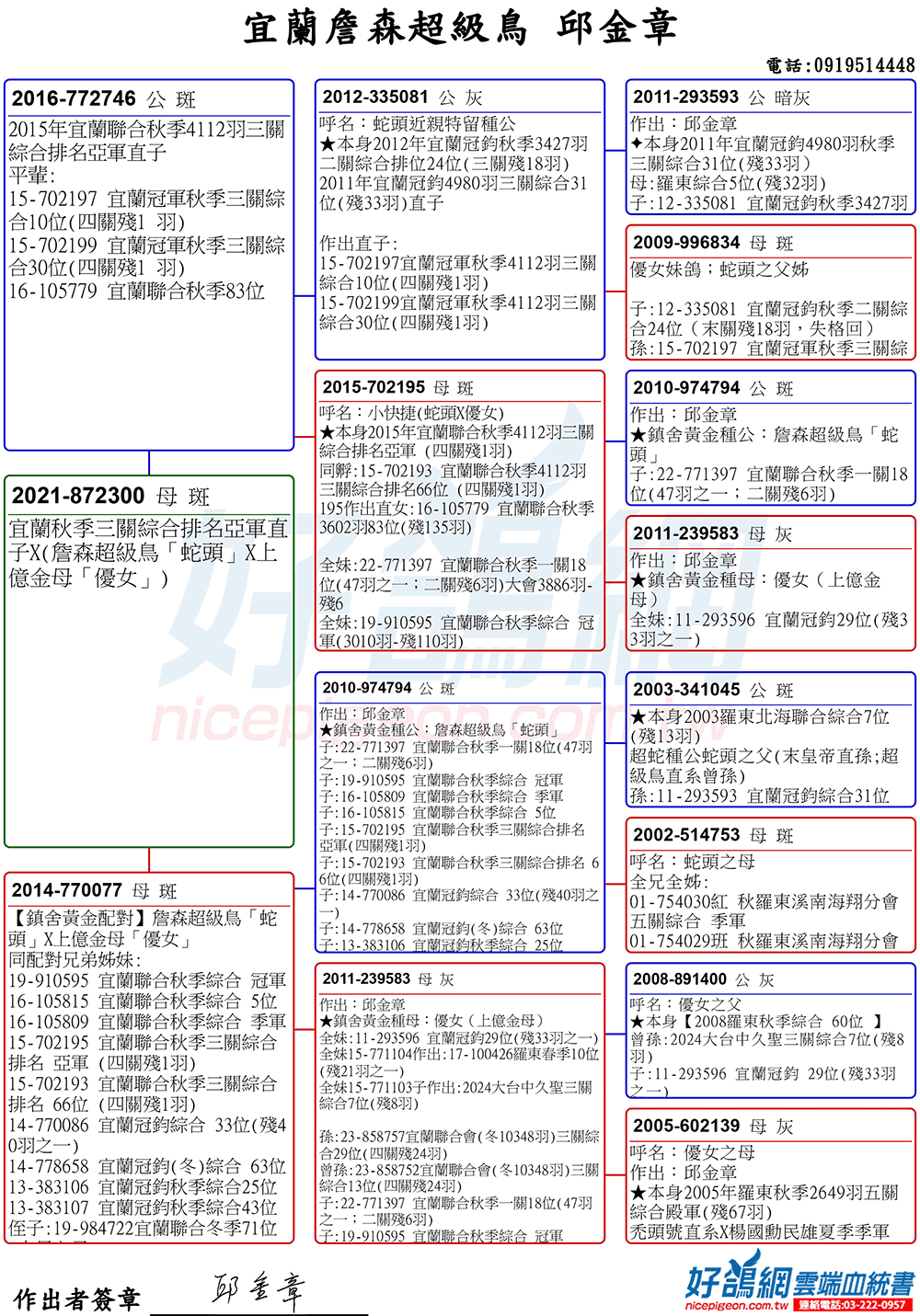 「超級鳥蛇頭」與「上億金母優女」這個黃金組合,為邱金章鴿舍打下穩固的基石,作出不計其數的入賞鴿,為邱金章的海翔成績取得巨大的成就。