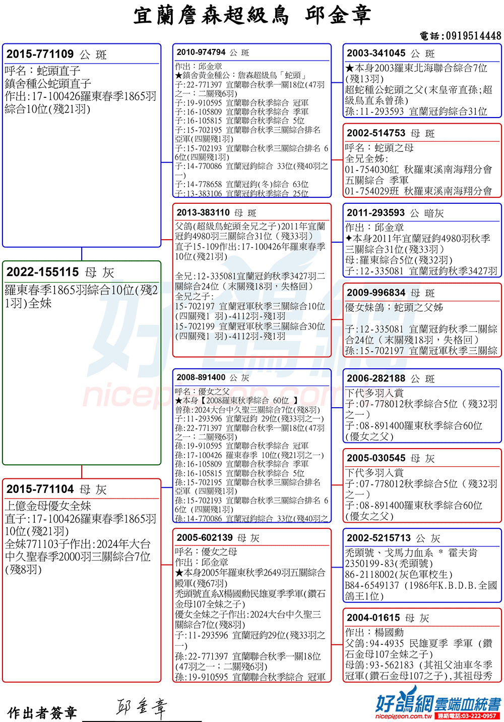 「超級鳥蛇頭」與「上億金母優女」這個黃金組合,為邱金章鴿舍打下穩固的基石,作出不計其數的入賞鴿,為邱金章的海翔成績取得巨大的成就。