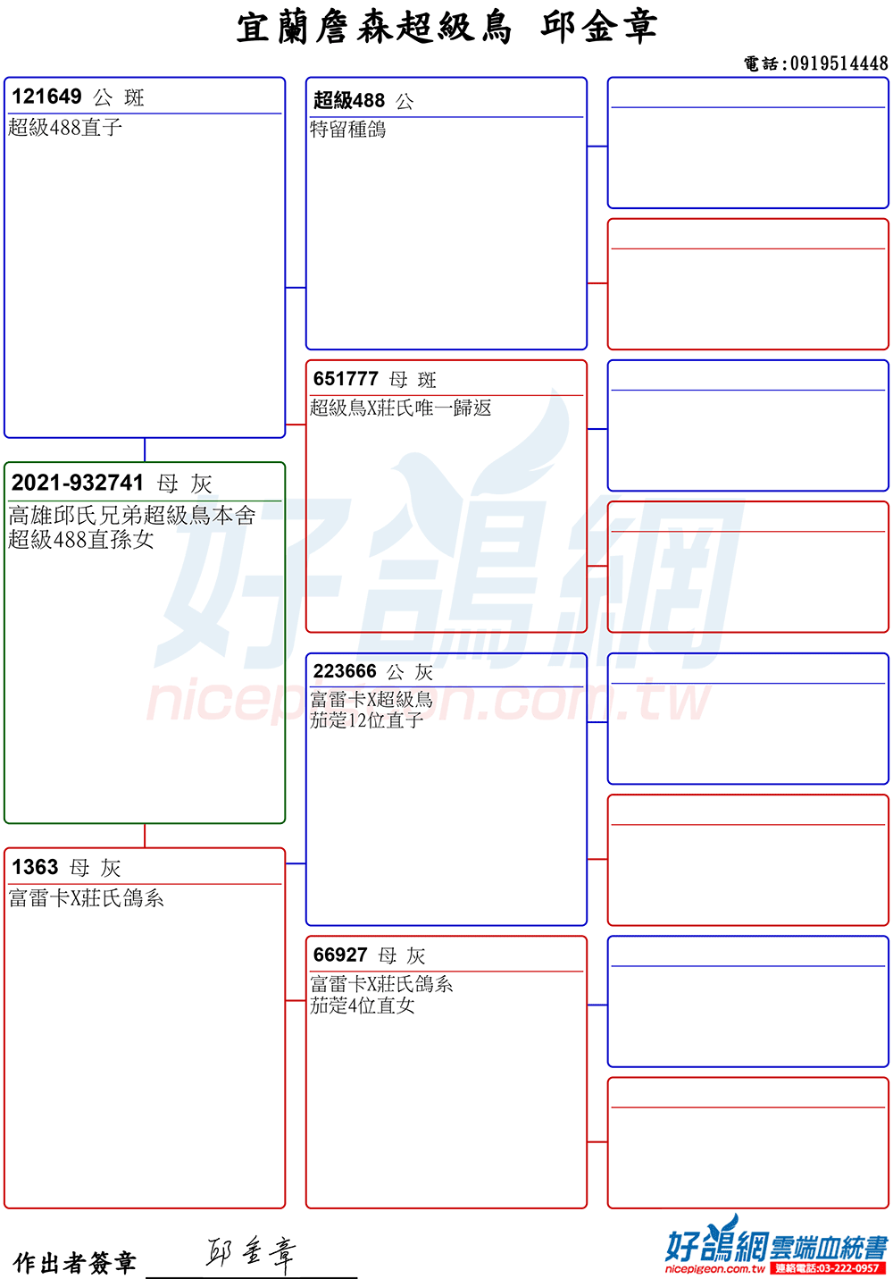 超級鳥原配對出自父鴿“斑格51”B51-6117447BC♂直孫,並與“老麥克斯”、“冠軍74”、“20號”等為堂兄弟鴿,牠是詹森兄弟、克拉克及哈透奇三位大師銘血結晶。