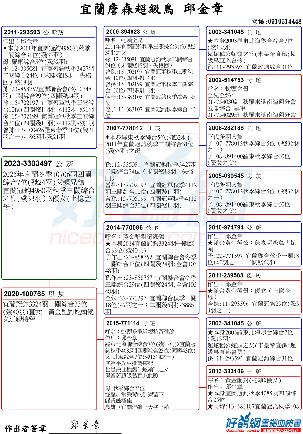 「超級鳥蛇頭」與「上億金母優女」這個黃金組合,為邱金章鴿舍打下穩固的基石,作出不計其數的入賞鴿,為邱金章的海翔成績取得巨大的成就。