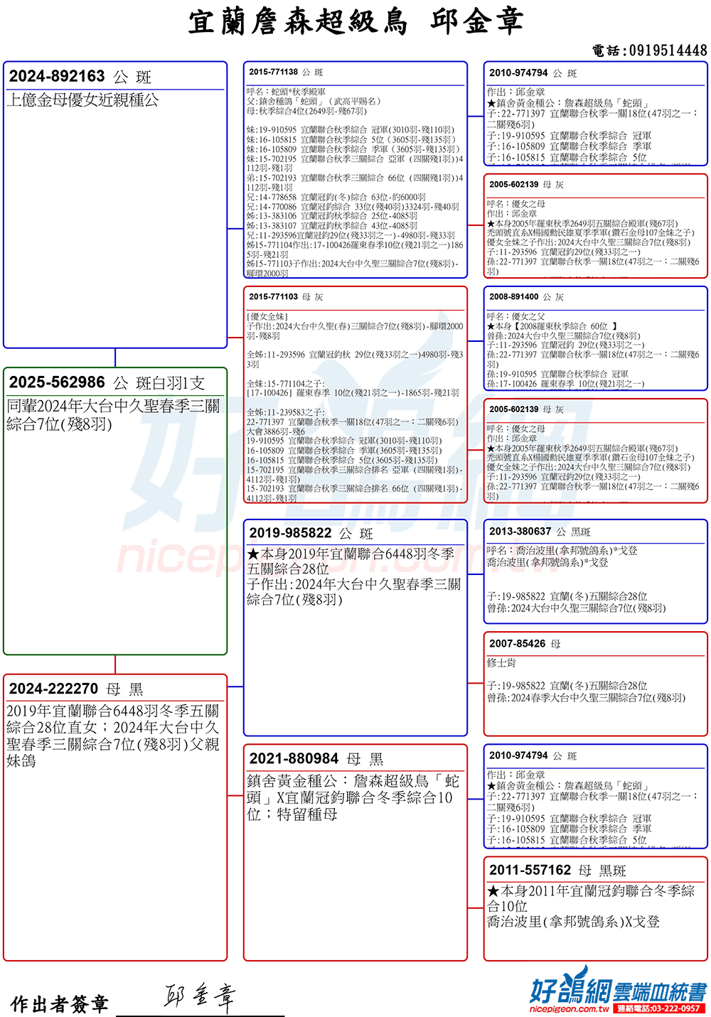「超級鳥蛇頭」與「上億金母優女」這個黃金組合,為邱金章鴿舍打下穩固的基石,作出不計其數的入賞鴿,為邱金章的海翔成績取得巨大的成就。