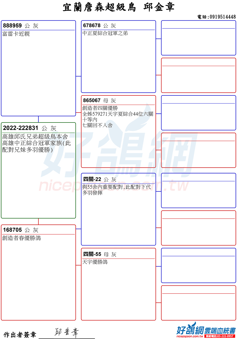 「超級鳥蛇頭」與「上億金母優女」這個黃金組合,為邱金章鴿舍打下穩固的基石,作出不計其數的入賞鴿,為邱金章的海翔成績取得巨大的成就。