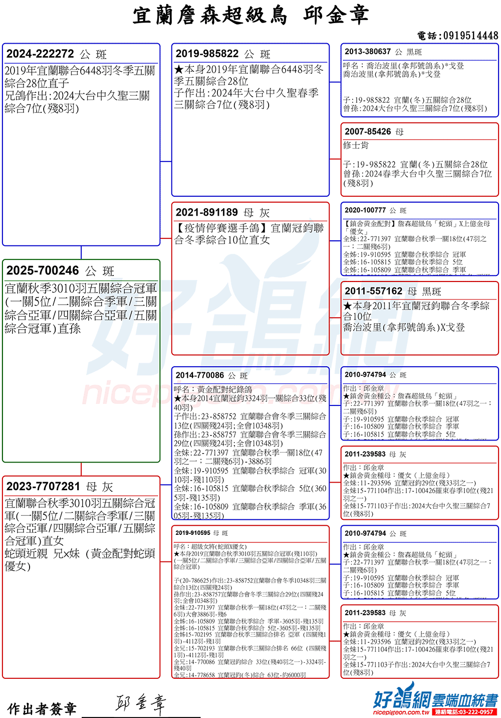 「超級鳥蛇頭」與「上億金母優女」這個黃金組合,為邱金章鴿舍打下穩固的基石,作出不計其數的入賞鴿,為邱金章的海翔成績取得巨大的成就。